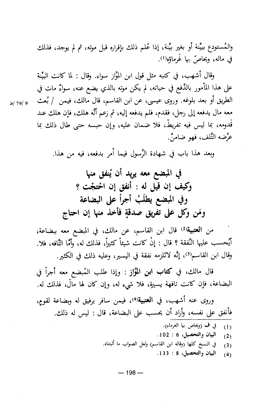 من العتبية قال ابن القاسم، عن مالك، في المبضع معه ببضاعة، أيحسب عليها النفقة؟ قال: إن كانت شيئا كثيرا، فذلك له، وأما التافه، فلا. وقال ابن القاسم، إنه لا تلزمه نفقة في اليسير، وعليه ذلك في الكثير.