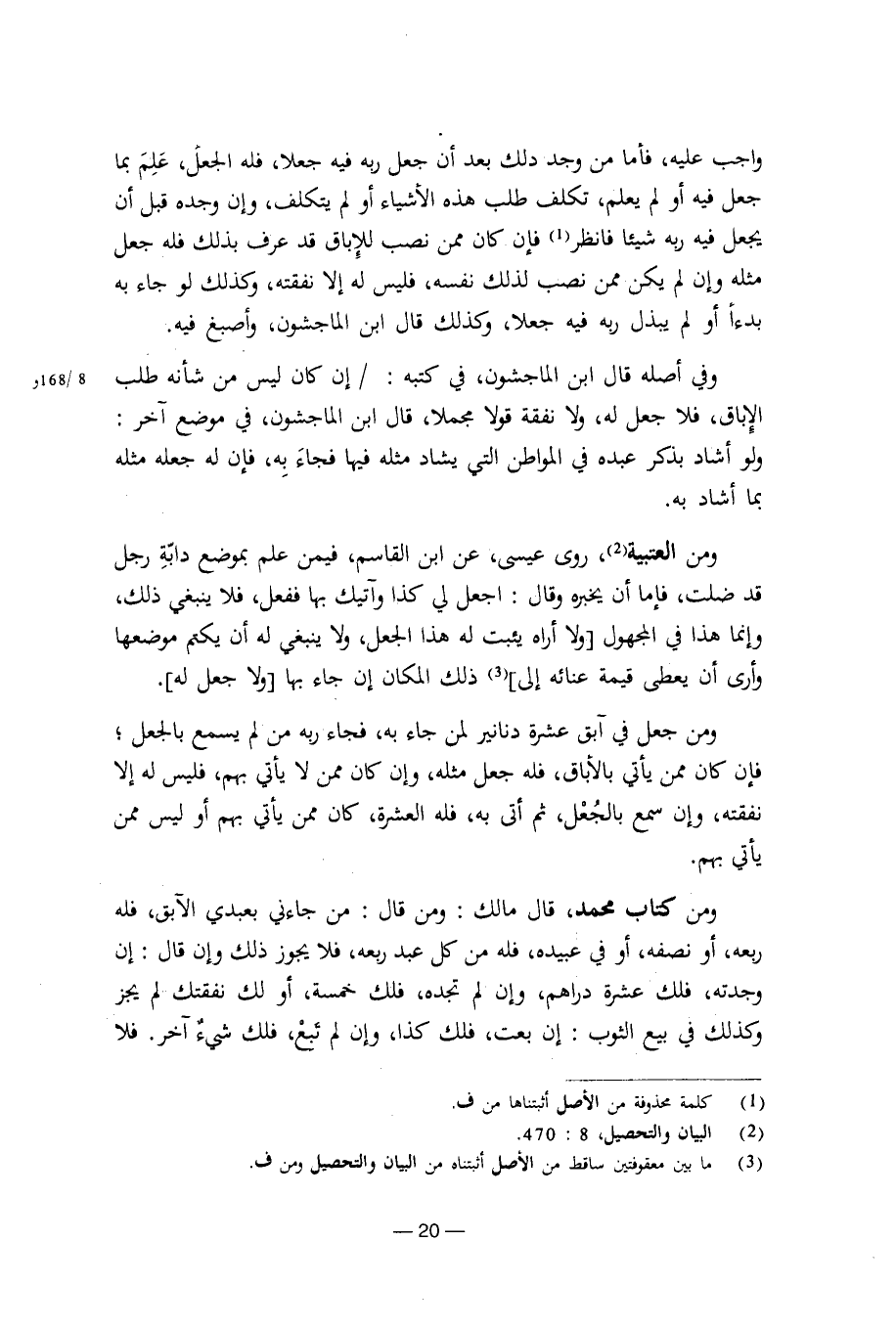 ومن كتاب محمد، قال مالك: ومن قال: جاءني بعبدي الآبق، فله ربعه، أو نصفه، أو في عبيده، فله من كل عبد ربعه، فلا يجوز ذلك وإن قال: إن وجدته، فلك عشرة دراهم، وإن لم تجده، فلك خمسة، أو لك نفقتك لم يجز وكذلك في بيع الثوب: إن بعت، فلك كذا، وإن لم تبع، فلك شيء آخر. فلا