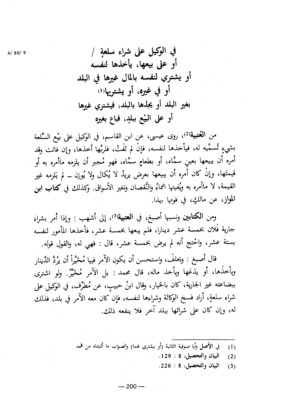 من العتبة، روى عيسى، عن ابن القاسم، في الوكيل على بيع السلعة بشيء تسميه له، فيأخذها لنفسه، فإن لم تفت، فلربها أخذها، وإن فاتت وقد أمره أن يبيعها بعين سماه، أو بطعام سماه، فهو مجبر أن يلزمه ما أمره به أو قيمتها، وإن كان أمره أن يبيعها بعرض يريد لا يكال ولا يوزن، لم يلزمه غير القيمة، لا ما أمره به ويفيتها النماء والنقصان وتغير الأسواق. وكذلك في كتاب ابن المواز، عن مالك، في فوتها بهذا.