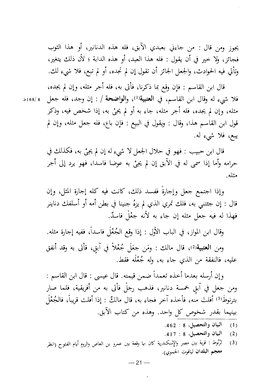 وإن أرسله بعدما أخذه تعمدا ضمن قيمته. قال عيسى: قال ابن القاسم: ومن جعل في آبق خمسة دنانير، فذهب رجل فأتى به من أفريقية، فلما صار بترنوط أفلت منه، فِأخذه آخر فجاء به، قال مالك: إذا أفلت قريبا، فالجعل بينهما بقدر شخوص كل واحد. وهذه من كتاب الآبق.