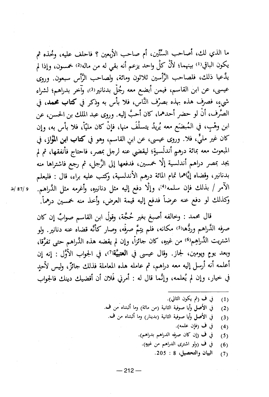 ما الذي، أصاحب الستين، أم صاحب الأربعين؟ فاحلف عليه، وخذه ثم يكون الباقي بينهما؛ لأن كل واحد يزعم أنه بقي له من ماله خمسون، وإذا لم يدعيا ذلك، فلصاحب الرأسين ثلاثون ومائة، ولصاحب الرأس سبعون. وروى عيسى، عن ابن القاسم، فيمن أبضع معه رجل بدنانير، وآخر بدراهم؛ لشراء شيء، فصرف هذه بهذه بصرف الناس، فلا بأس به وذكر في كتاب محمد، في الصرف، أن لو حضر أحدهما، كان أحب إليه. وروى عبد الملك بن الحسن،، ابن وهب: في المبضع مع يريد يتسلف منها فإن كان مليا، فلا بأس به، وإن كان غير ملي فلا. وروى عيسى، عن ابن القاسم، وهو في كتاب ابن المواز، في المبعوث معه بمائة درهم أندلسية؛ ليقضي عنه لرجل بمصر، فاحتاج فأنفقها، ثم لم يجد بمصر دراهم أندلسية إلا خمسين، فدفعها إلى الرجل، ثم رجع فاشتراها منه بدنانير، وقضاه إياهما تمام المائة درهم الأندلسية، وكتب عليه براء، قال: فليعلم الآمر / بذلك فإن سلمه، وإلا دفع إليه مثل دنانيره، وأغرمه مثل الدراهم. وكذلك لو دفع عنه عرضا فدفع إليه قيمة العرض، وأخذ منه خمسين درهما.