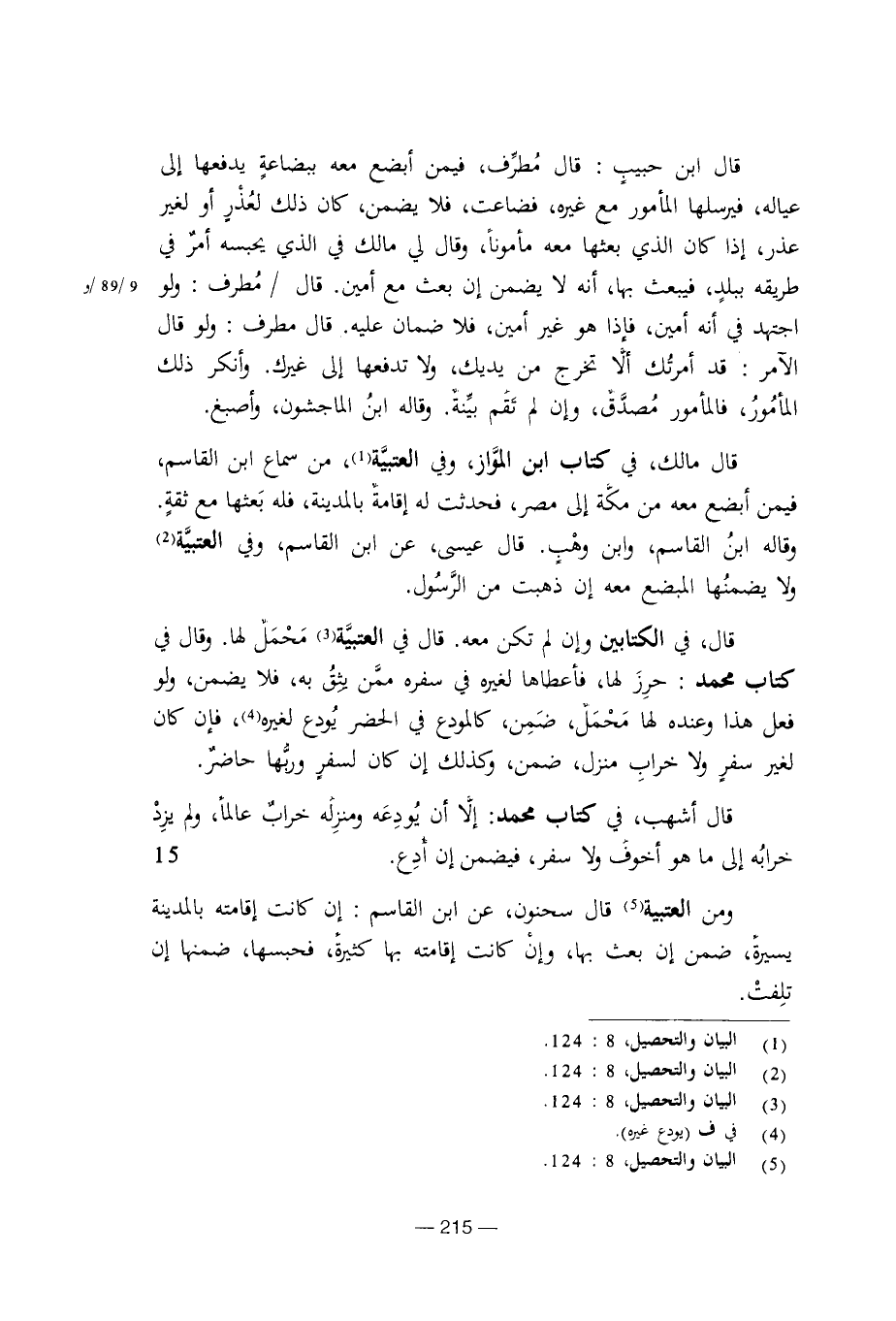 ومن العتبية قال سحنون، عن ابن القاسم: إن كانت إقامته بالمدينة يسيرة، ضمن إن بعث بها، وإن كانت إقامته بها كثيرة، فحبسها، ضمنها إن تلفت.
