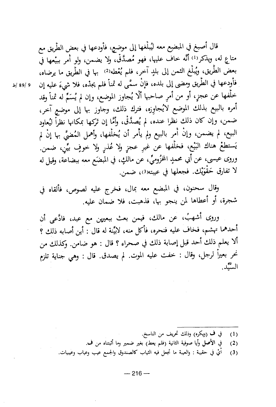 وروى عيسى، عن أبي محمد المخزومي، عن مالك، في المبضع معه ببضاعة، وقيل له لا تفارق حقوبك. فجعلها في عيبته، ضمن.