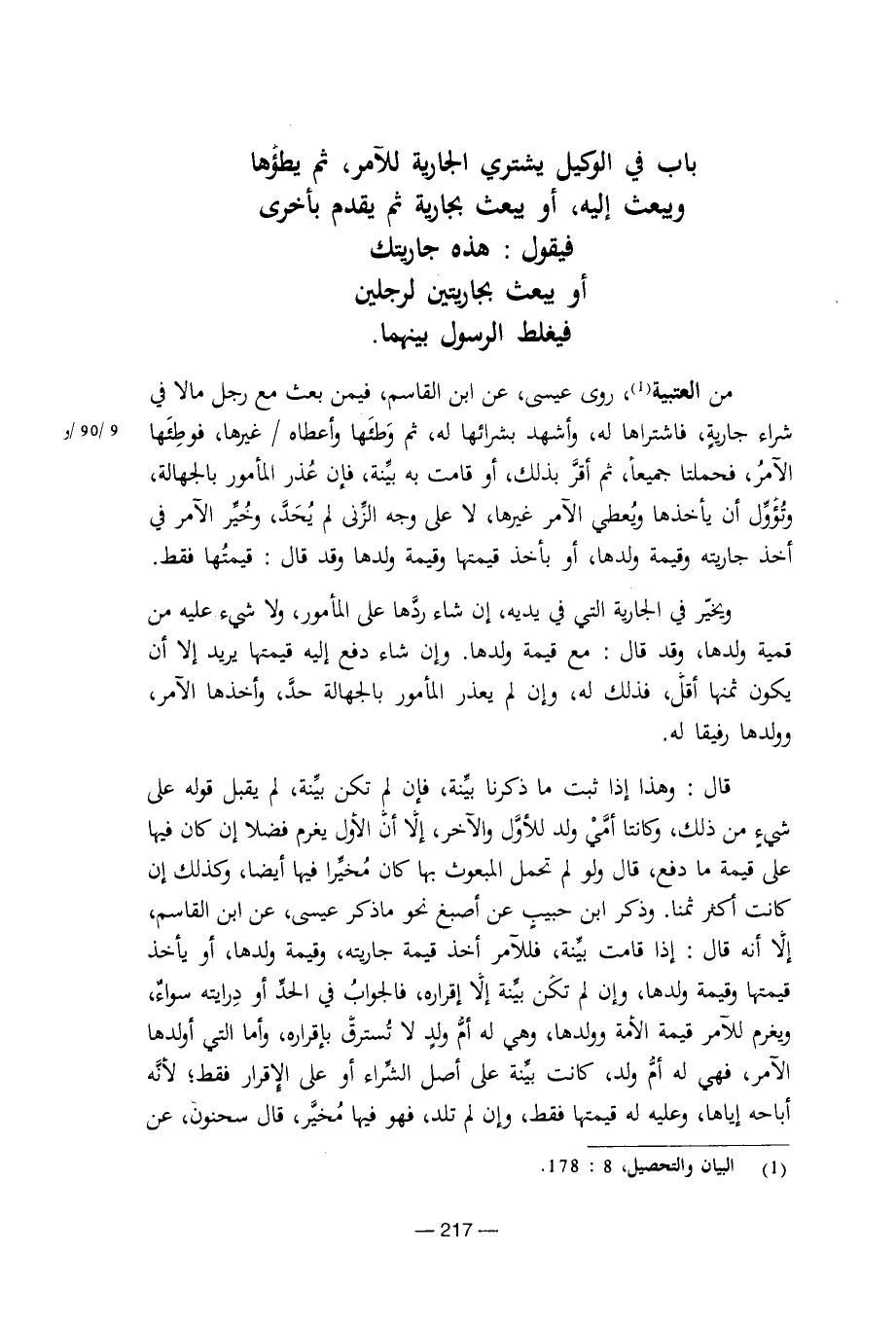 من العتبية، روى عيسى، عن ابن القاسم، فيمن بعث مع رجل مالا في شراء جارية، فاشتراها له، وأشهد بشرائها له، ثم وطئها وأعطاه / غيرها، فوطئها الآمر، فحلمتا جميعا، ثم أقر بذلك، أو قامت به بينة، فإن عذر المأمور بالجهالة، وتؤول أن يأخذها ويعطى الآمر غيرها، لا على وجه الزنى لم يحد، وخير الآمر في أخذ جاريته وقيمة ولدها، أو بأخذ قيمتها ولدها وقد قال: قيمتها فقط.