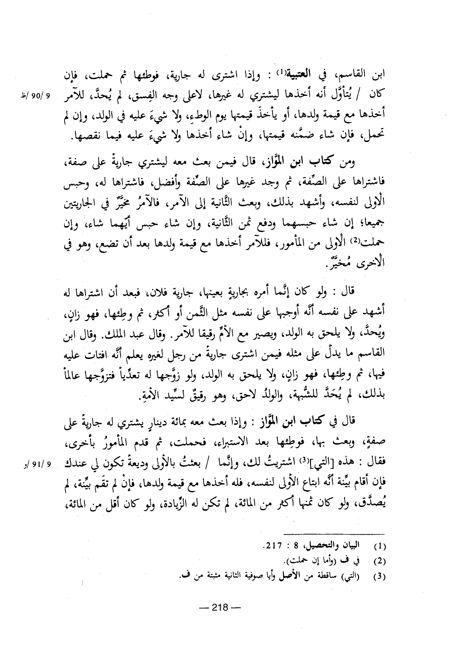 ومن كتاب ابن المواز، قال فيمن بعث معه ليشتري جارية على صفة، فاشتراها على الصفة، ثم وجد غيرها على الصفة وأفضل، فاشتراها له، وحبس الأولى لنفسه، وأشهد بذلك، وبعث الثانية إلى الآمر، فالآمر مخير في الجاريتين جميعا؛ إن شاء حبسهما ودفع ثمن الثانية، وإن شاء حبس أيهما شاء، وإن حلمت الأولى من المأمور، فللآمر أخذها مع قيمة ولدها بعد أن تضع، وهو في الأخرى مخير.