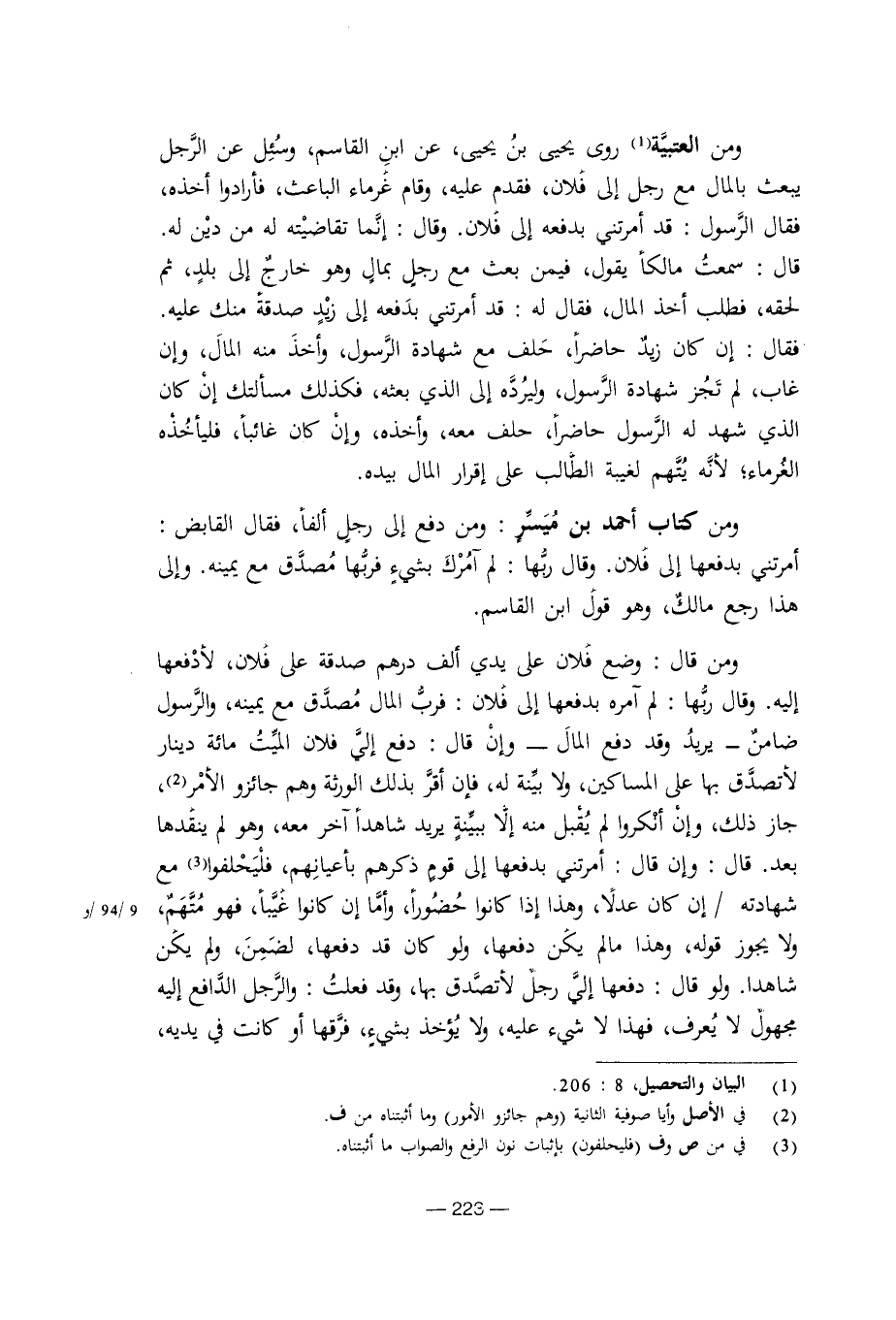 ومن العتبية روى يحيى بن يحيى، عن ابن القاسم، وسئل عن الرجل يبعث بالمال مع رجل إلى فلان، فقدم عليه، وقام غرماء الباعث، فأرادوا أخذه، فقال الرسول: قد أمرتني بدفعه إلى فلان. وقال: إنما تقاضيته له من دين له. قال: سمعت مالكا يقول، فيمن بعث مع رجل بمال وهو خارج إلى بلد، ثم لحقه، فطلب أخذ المال، فقال له: قد أمرتني بدفعه إلى زيد صدقة منك عليه.