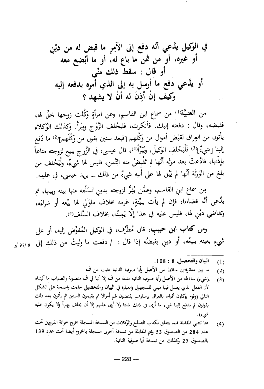 من العتبية من سماع ابن القاسم، وعن امرأة وكلت زوجها بحق لها، فقبضه، وقال: دفعته إليك. فأنكرت، فليحلف الزوج ويبرأ. وكذلك الوكلاء يأتون من العراق لقبض أموال من وكلهم [فبعد سنين يقول من وكلهم] ما دفع إلينا [بشيء] فليحلف الوكيل، ويبرأ، قال عيسى، في الزوج يبيع لزوجته متاعا بإذنها، فادعت بعد موته أنها لم تقبض منه الثمن؛ فليس لها شيء، وليحلف من بلغ من الورثة أنها لم يبق لها على أبيه شيء من ذلك ـ يريد عيسى، في علمه.
