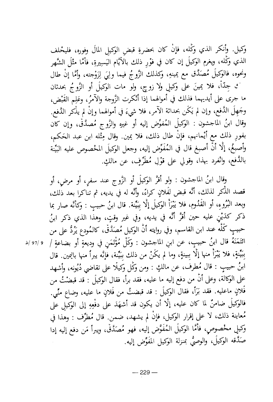وقال ابن الماجشون: ولو أقر الوكيل أو الزوج عند سفر، أو مرض، أو قصد الذكر لذلك، أنه قبض لفلان كراء، وأنه له في يديه، ثم تناكرا بعد ذلك، وبعد البروء، أو القدوم، فلا يبرأ الوكبل إلا ببينة. قال ابن حبيب: وكأنه صار بما ذكر كدين عليه حين أقر أنه في يديه، وفي غير وقت، وهذا الذي ذكر ابن حبيب كله عند ابن القاسم، وفي روايته أن الوكيل مصدق، كالمودع يرد على من ائتمنه قال ابن حبيب، عن ابن الماجشون: وكل مؤتمن في وديعة أو بضاعة / ببينة، فلا يبرأ منها إلا ببينة، ما لم يكن من ذلك ببينة، فإنه يبرأ منها باليمين. قال ابن حبيب: قال مطرف، عن مالك: ومن وكل وكيلا على تقاضى ديونه، وأشهد على الوكالة، وعلى أن من دفع إليه ما عليه، فقد برأ، فقال الوكيل: قد قبضت من فلان ما عليه. فقد برأ، فقال الوكيل: قد قبضت من فلان ما عليه، وضاع مني.