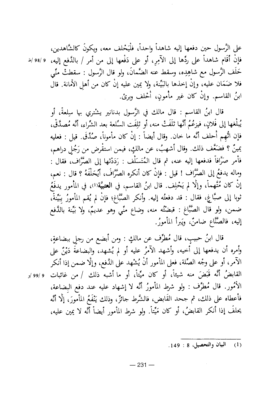 قال ابن القاسم: قال مالك في الرسول بدنانير يشتري بها سلعة، أو يبلغها إلى فلان، فيزعم أنها تلفت منه، أو تلفت السلعة بعد الشراء أنه مصدق، فإن اتهم أحلف أنه ما خان. وقال أيضا: إن كان مأمونا، صدق. قيل: فعليه يمين؟ فضعف ذلك. وقال أشهب، عن مالك، فيمن استقرض من رجل دراهم، فأمر صرافا فدفعها إليه عنه، ثم ابن القاسم المتسلف: رددتها إلى الصراف، فقال: وماله يدفع إلى الصراف! قيل: فإن كان أنكره الصراف، أيحلفه؟ قال: نعم، إن كان متهما، وإلا لم يحلف. قال ابن القاسم، في العتبية، في المأمور يدفع ثوبا إلى صباغ، فقال: قد دفعته إليه. وأنكر الصباغ، فإن لم يقم المأمور ببينة، ضمن، ولو قال الصباغ: قبضته منه، وضاع مني وهو عديم، ولا بينة بالدفع إليه، فالصناع ضامن، ويبرأ المأمور.