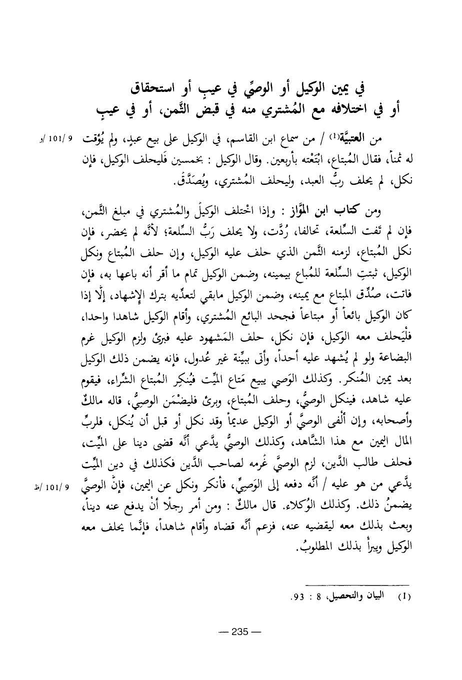 ومن كتاب ابن المواز: وإذا اختلف الوكيل والمشتري في مبلغ الثمن، فإن لم يفت السلعة، تحالفا، ولا يحلف رب السلعة، لأنه لم يحضر، فإن نكل المبتاع، لزمته الثمن الذي حلف عليه الوكيل، وإن حلف المبتاع ونكل الوكيل، ثبتت السلعة للمباع بيمينه، وضمن الوكيل ما بقي لتعديه بترك الإشهاد، إلا إذا كان الوكيل بائعا أو مبتاعا فجحد البائع المشتري، وأقام الوكيل شاهدا واحدا، فليحلف معه الوكيل، فإن نكل، حلف المشهود عليه فبرئ ولزم الوكيل غرم البضاعة ولو لم يشهد عليه أحدا، وأتى ببينة غير عدول، فإنه يضمن ذلك الوكيل بعد يمين المنكر. وكذلك الوصي يبيع متاع الميت فينكر المبتاع الشراء، فيقوم عليه شاهدا، فينكل الوصي، وحلف المبتاع، وبرئ فليضمن الوصي، قاله مالك وأصحابه، وإن ألقى الوصي أو الوكيل عديما وقد نكل أو قبل أن ينكل، فلرب المال اليمين مع هذا الشاهد، وكذلك الوصي يدعي أنه قضى دينا على الميت، فحلف طالب الدين، لزم الوصي عزمه لصاحب الدين فكذلك في دين الميت يدعي من هو عليه / أنه دفعه إلى الوصي، فأنكر ونكل عن اليمين، فإن الوصي يضمن ذلك. وكذلك الوكلاء. قال مالك: ومن أمر رجلا أن يدفع عنه دينا، وبعث بذلك معه ليقضيه عنه، فزعم أنه قضاه وأقام شاهدا، فإنما يحلف معه الوكيل ويبرأ بذلك المطلوب.
