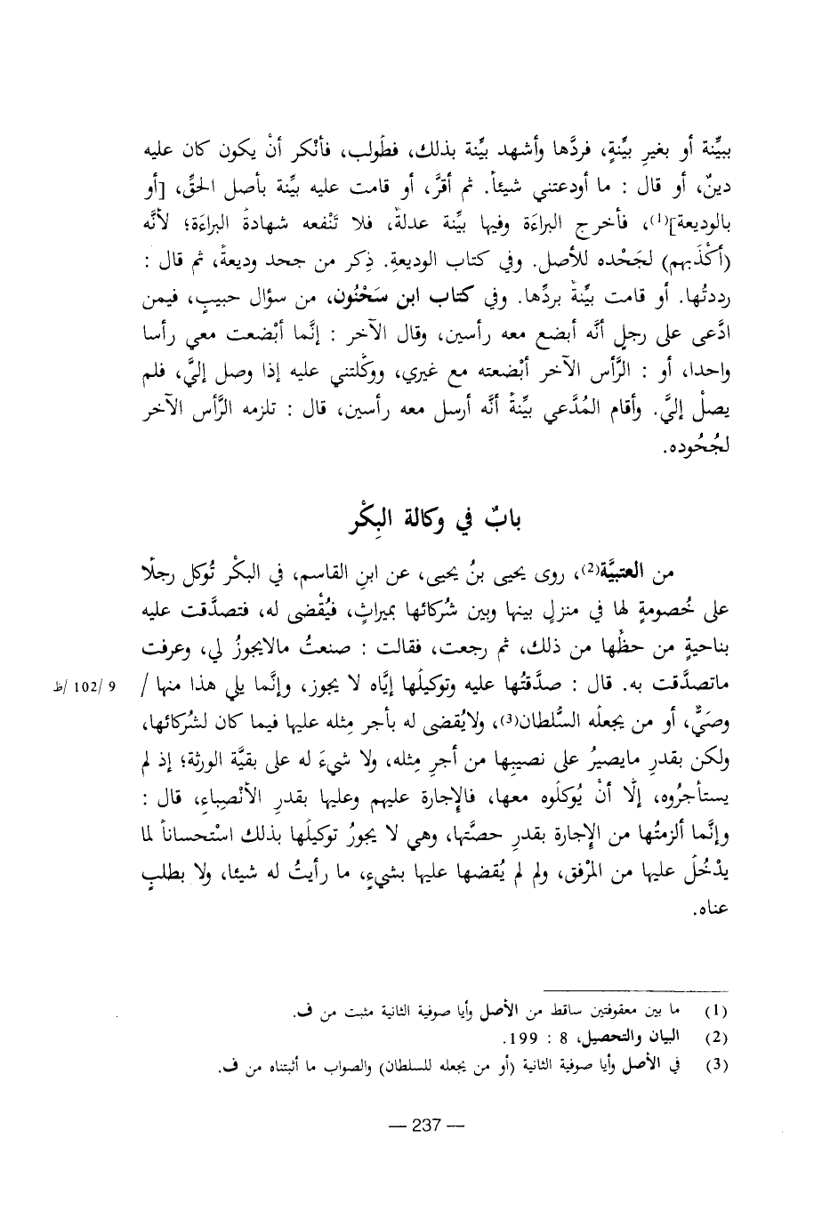 من العتبية، روى يحيى بن يحيى، عن ابن القاسم، في البكر توكل رجلا على خصومة لها في منزل بينها وبين شركائها بميراث، فيقضي له، فتصدقت عليه بناحية من حظها من ذلك، ثم رجعت، فقالت: صنعت ما لا يجوز إلي، وعرفت ما تصدقت به. قال: صدقتها عليه وتوكيلها إياه لا يجوز، وإنما يلي منها / وصي، أو من يجعله السلطان، ولا يقضي له بأجر مثله عليها فيما كان لشركائها، ولكن بقدر ما يصير على نصيبها من أجر مثله، ولا شيء له على بقية الورثة، قال: وإنما ألزمتها من الإجارة بقدر حصتها، وهي لا يجوز توكيلها بذلك استحسانا لما يدخل عليها من المرفق، ولم لم يقضها عليها بشيء ما رأيت له شيئا، ولا بطلب عناه.