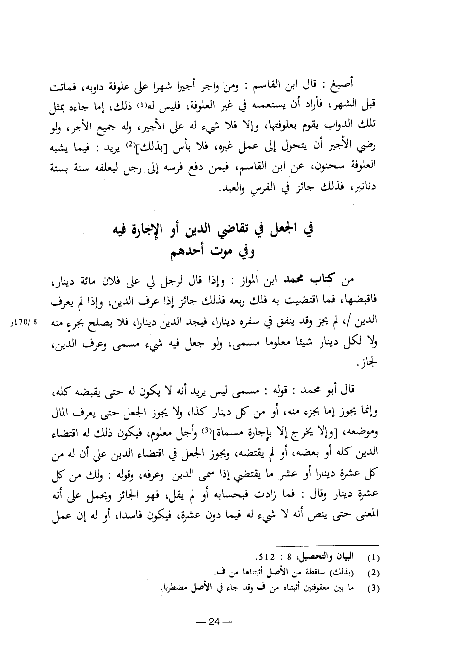 قال محمد: قوله: مسمى ليس يريد أنه لا يكون له حتى يقبضه كله، وإنما يجوز إما بجزء منه، أو من كل دينار كذا، ولا يجوز الجعل حتى يعرف المال وموضعه، [وإلا يخرج إلا بإجارة مسماة] وأجل معلوم، فيكون ذلك له اقتضاء الدين كله أو بعضه، أو لم يقتضه، ويجوز الجعل في اقتضاء الدين على أن له من كل عشرة دينارا أو عشر ما يقتضى إذا سمى الدين وعرفه، وقوله: ولك من كل عشرة دينار قال: فما زادت فبحسابه أو لم يقل، فهو الجائز ويحمل على أنه المعنى حتى ينص أنه لا شيء له فيما دون العشرة، فيكون فاسدا، أو له إن عمل
