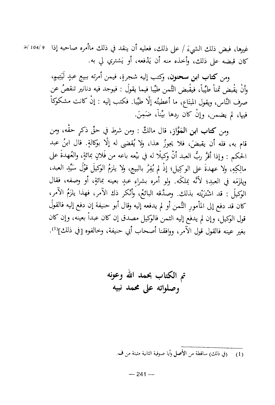 ومن كتاب ابن سحنون، وكتب إليه شجرة، فيمن أمرته ببيع عبد ليتيم، وأن يقبض ثمنا طيبا، فيقبض الثمن طيبا فيما يقول: فيوجد فيه دنانير تنقص عن صرف الناس، ويقول المبتاع، ما أعطيته إلا طيبا. فكتب إليه: إن كانت مشكوكا فيها، ولم يضمر، وإن كان ردها بينا، ضمن.
