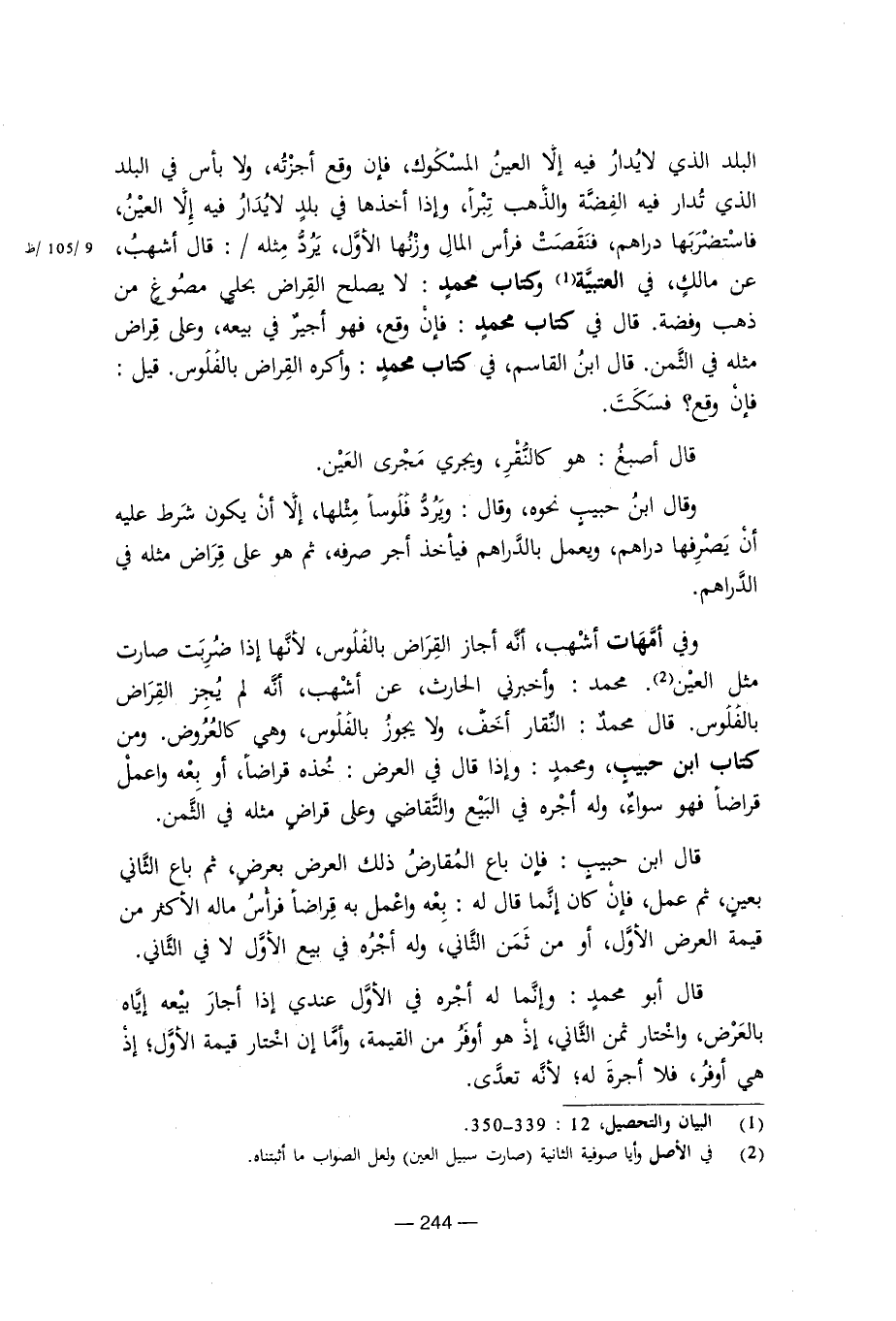البلد الذي لا يدار فيه إلا العين المسكوك، فإن وقع أجزته، ولا بأس في البلد الذي تدار فيه الفضة والذهب تبرا، وإذا أخذها في بلد لا يدار فيه إلا العين، فاستضربها دراهم، فنقصت فرأس المال وزنها الأول، يرد مثله /: قال أشهب، عن مالك، في العتبية وكتاب محمد: لا يصلح القراض بحلي مصوغ من ذهب وفضة. قال في كتاب محمد: فإن وقع، فهو أجير في بيعه، وعلى قراض مثله في الثمن. قال ابن القاسم، في كتاب محمد: وأكره القراض بالفلوس. قيل: فإن وقع؟ فسكت.