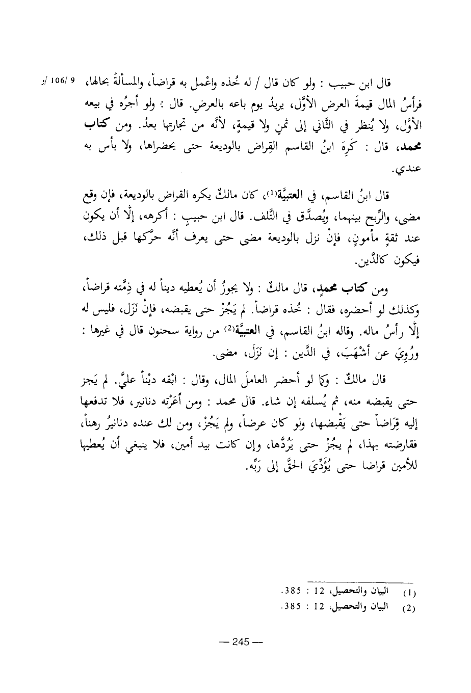 قال ابن حبيب: ولو كان قال / له خذه واعمل به قراضا، والمسألة بحالها، فرأس المال قيمة العرض الأول، يريد يوم باعه بالعرض. قال: ولو أجره في بيعه الأول، ولا ينظر في الثاني إلى ثمن ولا قيمة، لأنه من تجارتها بعد. ومن كتاب محمد، قال: كره ابن القاسم القراض بالوديعة حتى يحضراها، ولا بأس به عندي.