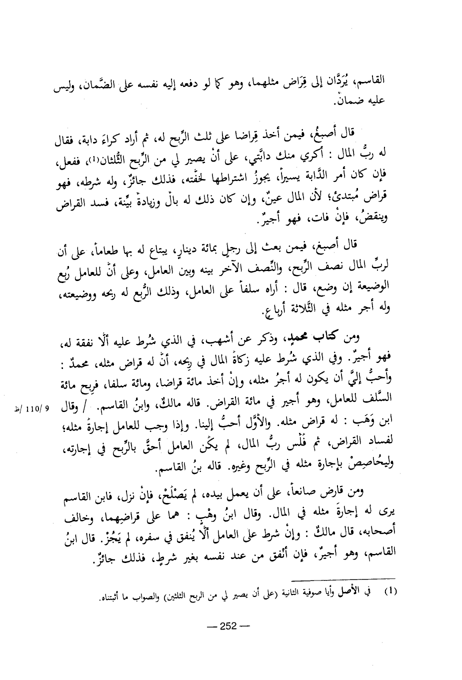 ومن كتاب محمد، وذكر عن أشهب، في الذي شرط عليه ألا نفقة له، فهو أجير. وفي الذي شرط عليه زكاة المال في ربحه، أن له قراض مثله، محمد: وأحب إلي أن يكون له أجر مثله، وإن أخذ مائة قراضا، ومائة سلفا، فربح مائة السلف للعامل، وهو أجير في مائة القراض. قاله مالك، وابن القاسم. / وقال ابن وهب: له قراض مثله. والأول أحب إلينا. وإذا وجب للعامل إجارة مثله؛ لفساد القراض، ثم فلس رب المال، لم يكن العامل أحق الربح في إجارته، وليحاصص بإجارة مثله في الربح وغيره. قاله ابن القاسم.