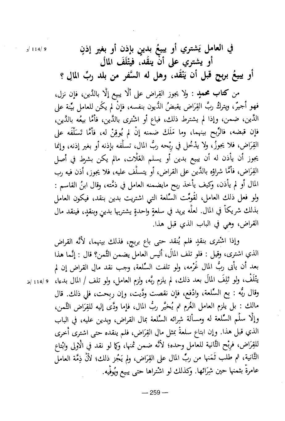 من كتاب محمد: ولا يجوز القراض على ألا يبيع إلا بالدين، فإن نزل، فهو أجير، ويترك رب القراض يقبض الديون بنفسه، فإن لم يكن للعامل بينة على الدين، ضمن، وإذا لم يشترط ذلك، فباع أو اشترى بالدين، فأما بيعه بالدين، فإن قبضه، فالربح بينهما، وما ملك ضمنه إن لم يوقن له، فأما تسلفه على القراض، فلا يجوز، ولا يدخل في ربحه رب المال، تسلفه بإذنه أو بغير إذنه، وإنما يجوز أن يأذن له أن يبيع بدين أو يسلم الغلات، ما لم يكن بشرط في أصل القراض، فأما شراؤه بالدين على القراض، أو يتسلف عليه، فلا يجوز، أذن فيه رب المال أو لم يأذن، وكيف يأخذ ربح ما يضمنه العامل في ذمته، وقال ابن القاسم: ولو فعل ذلك العامل، لقومت السلعة التي اشتريت بدين بنقد، فيكون العامل بذلك شريكا في العامل، لقومت السلعة التي اشريت بدين بنقد، فيكون العامل بذلك شريكا في المال. لعله يريد في سلعة واحدة يشتريها بدين وبنقد، فينقد مال القراض، وهي في الباب الذي قبل هذا.