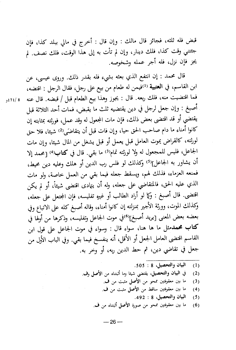 قال محمد: إن انتفع الذي بعثه بشيء فله بدر ذلك. وعيسى، عن ابن القاسم، في العتبية فيمن له طعام من بيع على رجل، فقال الرجل: اقتضه، فما اقتضيت منه، فلك ربعه. قال: ويجوز وهذا بيع الطعام قبل / قبضه. قال عنه أصبغ: وإن جعل لرجل في دين يقتضيه ثلث ما يقبض، فمات أحد الثلاثة قبل يقتضي أو قد اقتضى بعض ذلك، فإن مات المجعول له وقد عمل، فورثته بمثابته إن كانوا أمناء ما دام صاحب الحق حيا، وإن فات قبل أن يتقاضى شيئا، فلا حق لورثته، كالقراض يموت العامل قبل يعمل أو ق بل يشغل من المال شيئا، وإن مات الجاعل، فليس للمجعول له ولا لورثته تمام ما بقي. قال: في كتاب [محمد إلا أن يشاور به الجاعل] وكذلك لو فلس رب الدين أو هلك وعليه دين محيط، فمنعه العزماء، فذلك لهم، ويسقط جعله فيما بقي من العمل خاصة، ولو مات الذي عليه الحق، فالمتقاضي على جعله، وله أن يتمادى اقتضى شيئا، أو لم يكن اقتضى. قال أصبغ: وكما لو أراد الطالب أو غيره تفليسه، فإن المجتعل على جعله، وكذلك الموت وورثة الأجير بمنزلته إن كانوا أمناء، وقاله أصبغ كله على الاتباع وفي بعضه بعض المعنى [يريد أصبغ] في موت الجاعل وتفليسه، وذكرها من أولها في كتاب محمد مثل ما ها هنا، سواء قال: وسواء في موت الجاعل على قول ابن القاسم اقتضى العامل الجعل أو الأقل، أنه ينفسخ فيما بقي. وفي الباب الأول من جعل في تقاضي دين، ثم حط الدين ربه، أو وخر به.