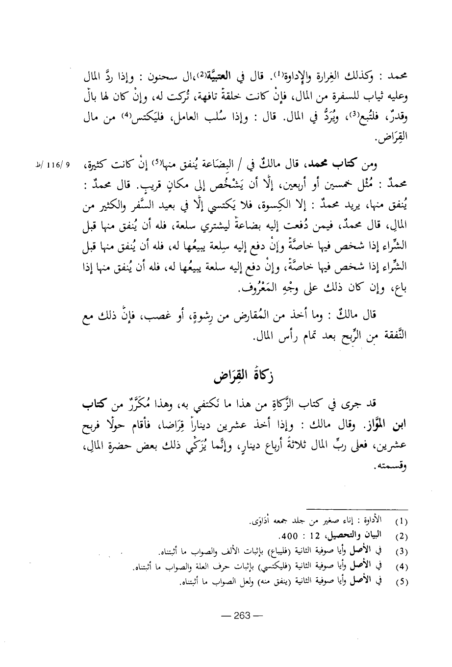 محمد: وكذلك الغرارة والإداوة. قال في العتبية، قال سحنون: وإذا رد المال وعليه ثياب للسفرة من المال، فإن كانت خلقة تافهة، تركت له، وإن كان لها بال وقدر، فلتبع، ويرد في المال. قال: وإذا سلب العامل، فليكنس من مال القراض.