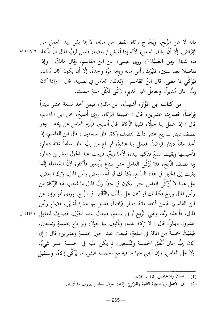 من كتاب ابن المواز، أشهب، عن مالك، فيمن أخذ تسعة عشر دينارا قراضا، فصارت عشرين، قال: عليهما الزكاة. روى أصبغ، عن ابن القاسم، قال: إذا عمل بها حولا، ففيها الزكاة. قال أصبغ: فيلزم العامل عن ربحه ـ وهو نصف دينار ـ ربع عشر ذلك النصف زكاة. قال سحنون: قال ابن القاسم، إذا أخذ مائة دينار قراضا. فعمل بها عشرة، ثم باع من رب المال سلفا بمائة دينار، فأحبسها وبقيت سلع فتركها بيده؛ لأنها ربح، فبيعت عند الحول بعشرين دينارا، وله نصف الربح، فلا يزكى العامل حتى يبتاع بأربعين فأكثر، لأن المعاملة إنما بقيت إلى الحول في هذه السلع. وكذلك لو أخذ بعض رأس المال، وترك البعض، على هذا لا يزكي العامل حتى يكون في حظ رب المال ما تجب فيه الزكاة من رأس المال وربح فكذلك لو كان على الثلث والثلثين في الربح. وروى أبو زيد، عن ابن القاسم، فيمن أخذ مائة دينار قراضا، فعمل بها عشرة أشهر، فضاع رأس المال، فأخذه ربه، وبقي الربح / في سلعة، فبيعت عند الحول، فصارت للعامل عشرون دينارا، قال: لا زكاة عليه، ويأتنف بها حولا، ولو باع بخمسة وتسعين، فبقيت خمسة من المائة في سلعة، فبيعت عند الحول بخمسة وعشرين، قال: إن كان رب المال أنفق الخمسة والتسعين، لم يكن عليه في الخمسة عشر شيء، ولا على العامل، وإن أبقي منها ما فيه مع الخمسة عشر، ما يزكى زكاه، واستقبل