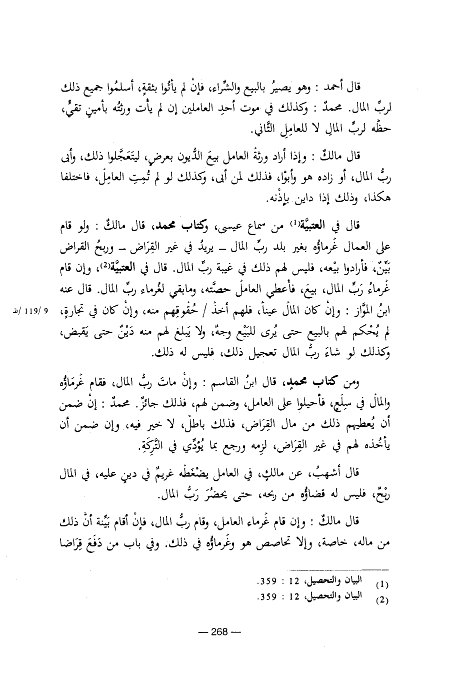 قال في العتبية من سماع عيسى، وكتاب محمد، قال مالك: ولو قام على العمال غرماؤه بغير بلد رب المال ـ يريد في غير القراض ـ وربح القراض بين، فأرادوا بيعه، فليس لهم ذلك في غيبة رب المال. قال في العتبية، وإن قام غرماء رب المال، بيع، فأعطي العامل حصته، وما بقي لغرماء رب المال. قال عنه ابن المواز: وإن كان المال عينا، فلهم أخذ / حقوقهم منه، وإن كان في تجارة، لم يحكم لهم بالبيع حتى يرى للبيع وجه، ولا يبلغ لهم منه دين حتى يقبض، وكذلك لو شاء رب المال تعجيل ذلك، فليس له ذلك.