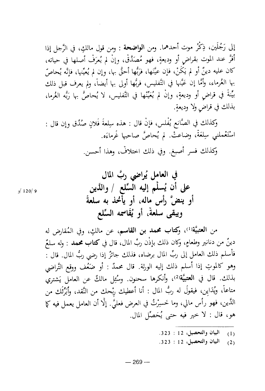 إلى رجلين، ذكر موت أحداهما. ومن الواضحة: ومن قول مالك، في الرجل إذا أقر عند الموت بقراض أو وديعة، فهو مصدق، وإن لم يعرف أصلها في حياته، كان عليه دين أو لم يكن، فإن عينها، فربها أحق بها، وإن لم يعينها، فإنه يحاص بها الغرماء، وأما إن عينها في التفليس، فربها أولى بها أيضا، ولم يعرف قبل ذلك بينة في قراض أو وديعة، وإن لم يعنيها في التفليس، لا يحاص بها ربه الغرماء بذلك في قراض ولا وديعة.
