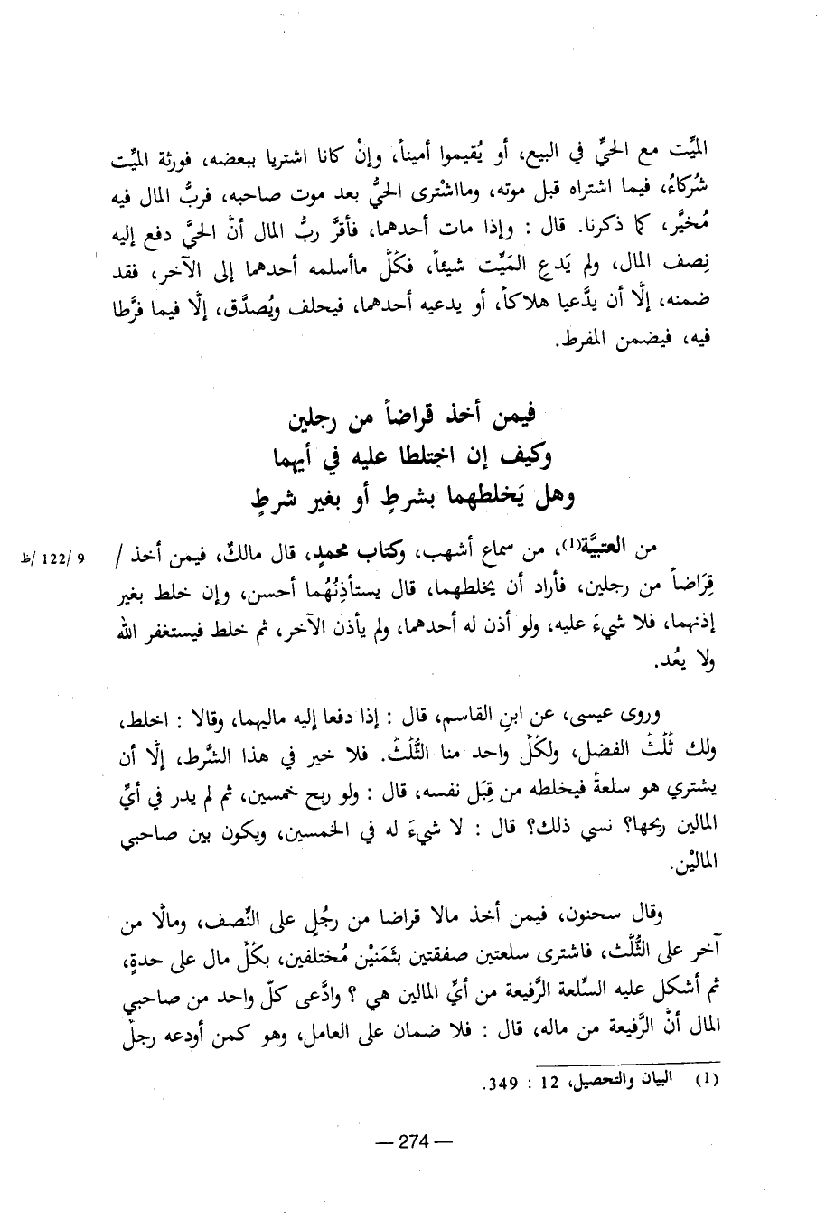 وقال سحنون: فيمن أخذ مالا قراضا من رجل على النصف، ومالا من آخر على الثلث، فاشترى سعلتين صفقتين بثمنين مختلفين بكل مال على حدة، ثم أشكل عليه السلعة الرفيعة من أي المالين هي؟ وادعى كل واحد من صاحبي المال أن الرفيعة من ماله، فلا ضمان على العامل، وهو كمن أودعه رجل