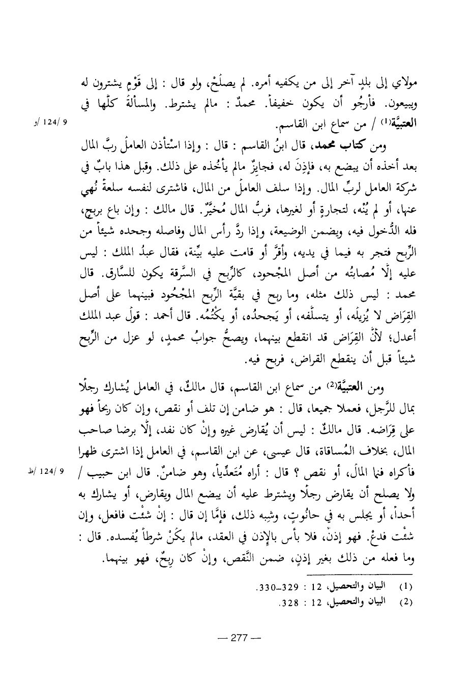 ومن العتبية من سماع ابن القاسم، قال مالك، في العامل يشارك رجلا بمال الرجل، فعملا جميعا، قال: هو ضامن إن تلف أو نقص، وإن كان ربحا فهو على قراضه، قال مالك: ليس أن يقارض غيره وإن كان نفد، إلا برضا صاحب المال، بخلاف المساقاة، قال عيسى، عن ابن القاسم، في العامل إذا اشترى ظهرا فأكراه فنما المال، أو نقص؟ قال: أراه متعديا، وهو ضامن. قال ابن حبيب / ولا يصلح أن يقارض رجلا ويشترط عليه أن يبضع المال ويقارض، أو يشارك به أحدا، أو يجلس به في حانوت نه وشبه ذلك، فإما إن قال: إن شئت فافعل، وإن شئت فدع. فهو إذن، فلا بأس بالإذن في العقد، ما لم يكن شرط يفسده. قال: وما فعله من ذلك بغير إذن، ضمن النقص، وإن كان ربح، فهو بينهما.