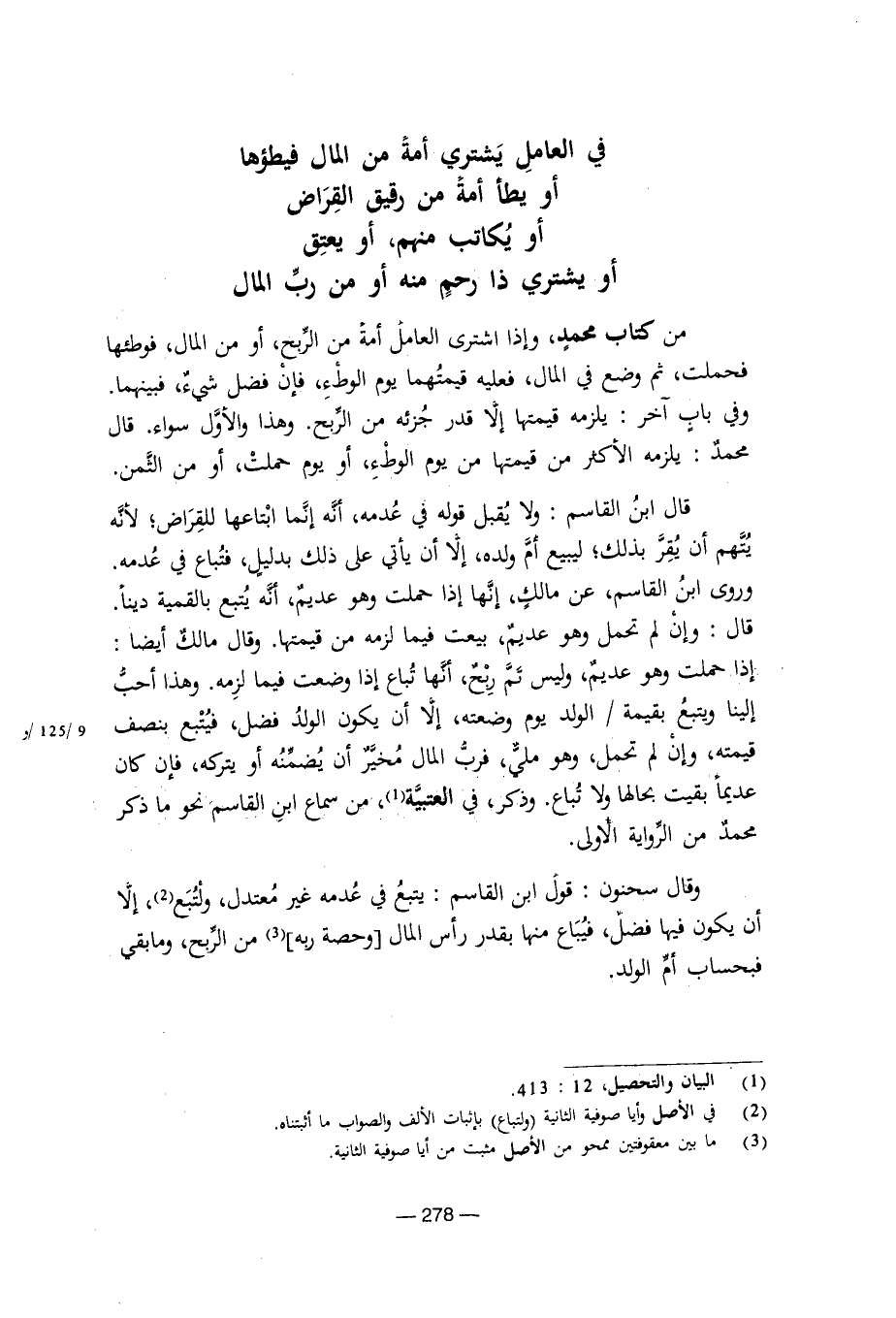 وروى ابن القاسم، عن مالك، إنها إذا ... حملت وهو عديم، أنه يتبع بالقيمة دينا. قال: وإن لم تحمل وهو عديم، بيعت فيما لزمه من قيمتها. وقال مالك أيضا: ... إذا حملت وهو عديم، وليس ثم ربح، أنها تباع إذا وضعت فيما لزمه. وهذا أحب إلينا ويتبع بقيمة / الولد يوم وضعته، إلا أن يكون الولد فضل، فيبتع بنصف قيمته، وإن لم تحمل، وهو ملي، فرب المال مخير أن يضمنه أو يتركه، فإن كان عديما بقيت بحالها ولا تباع. وذكر، في العتبية، من سماع ابن القاسم نحو ما ذكر؛ من الرواية الأول.