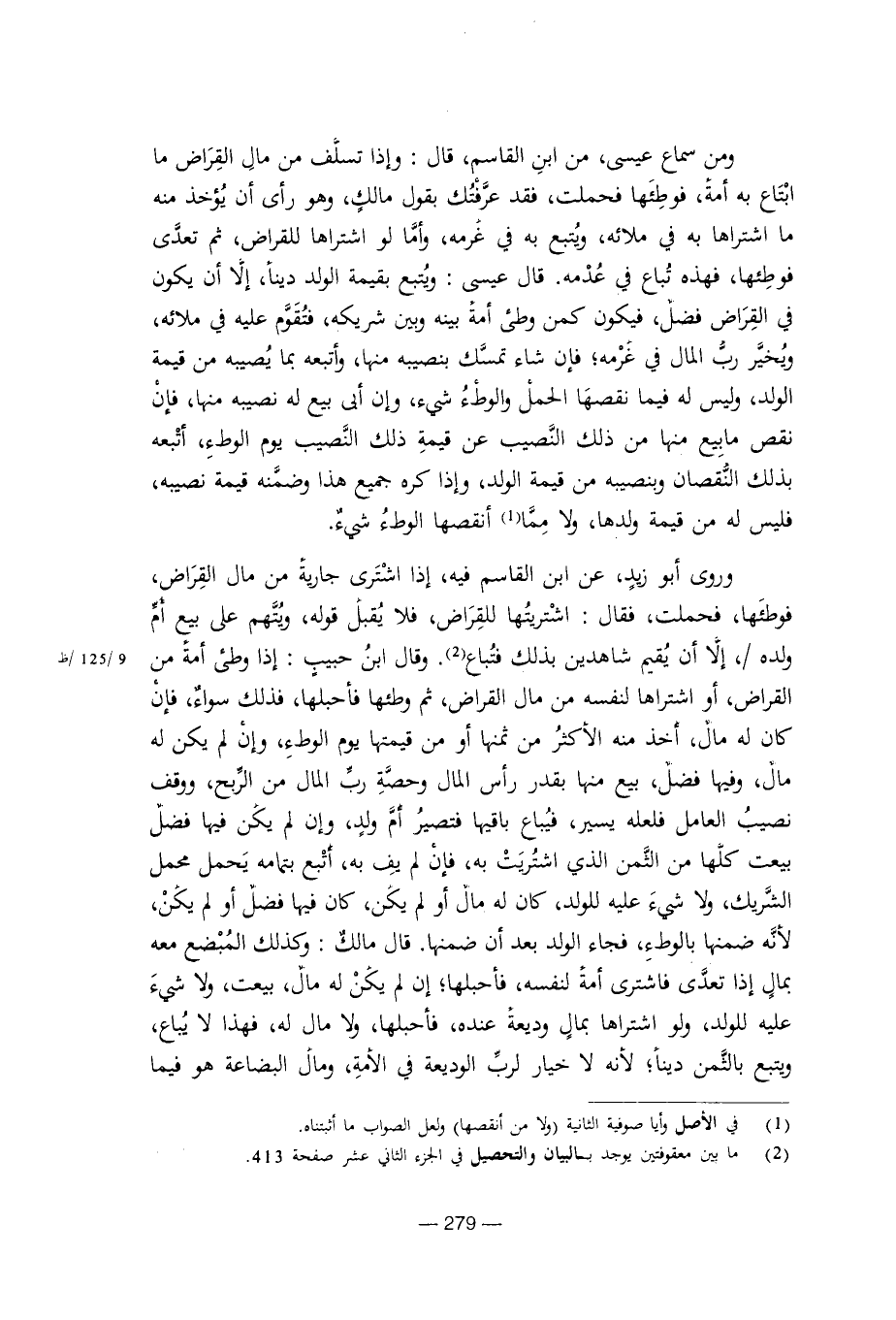 ومن سماع عيسى، من ابن القاسم، قال: وإذا تسلف من مال القراض ما اتباع به أمة، فوطئها فحملت، فقد عرفتك بقول مالك، وهو رأي أن يؤخذ منه ما اشتراها به في ملائه، ويتبع به في غرمه، وأما لو اشتراها للقراض؟ ثم تعدى فوطئها، فهذه تباع في عدمه. قال عيسى: ويتبع بقيمة الولد دينا، إلا أن يكون في القراض فضل، فيكون كمن وطئ أمة بينه وبين شريكه، فتقوم عليه في ملائه، ويخير رب المال في غرمه، فإن شاء تمسك بنصيبه منها، وأتبعه بما يصيبه من قيمة الولد، وليس له فيما نقصها الحمل والوطء شيء، وإن أبى بيع له نصيبه منها، فإن نقص مابيع منها من ذلك النصيب عن قيمة ذلك النصيب يوم الوطء، أتبعه بذلك النقصان وبنصيبه من قيمة الولد، وإذا كره جميع هذا وضمنه قيمة نصيبه، فليس له من قيمة ولدها، ولا مما أنقصها الوطء شيء.