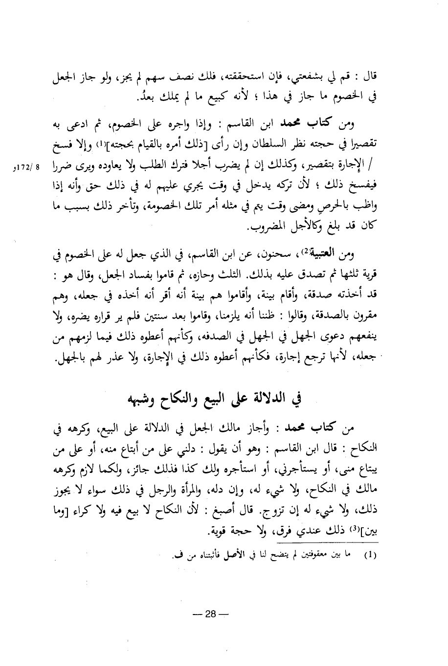 من كتاب محمد: وأجاز مالك الجعل في الدلالة على البيع، وكرهه في النكاح: قال ابن القاسم: وهو أن يقول: دلني على من أبتاع منه، أو على من يبتاع مني، أو يستأجرني، أو استأجره ولك كذا فذلك جائز، ولكما لازم وكرهه مالك في النكاح، ولا شيء له، وإن دله، والمرأة والرجل في ذلك سواء لا يجوز ذلك، ولا شيء له إن تزوج. قال أصبغ: لأن النكاح لا بيع فيه ولا كراء [وما بين] ذلك عندي فرق، ولا حجة قوية.
