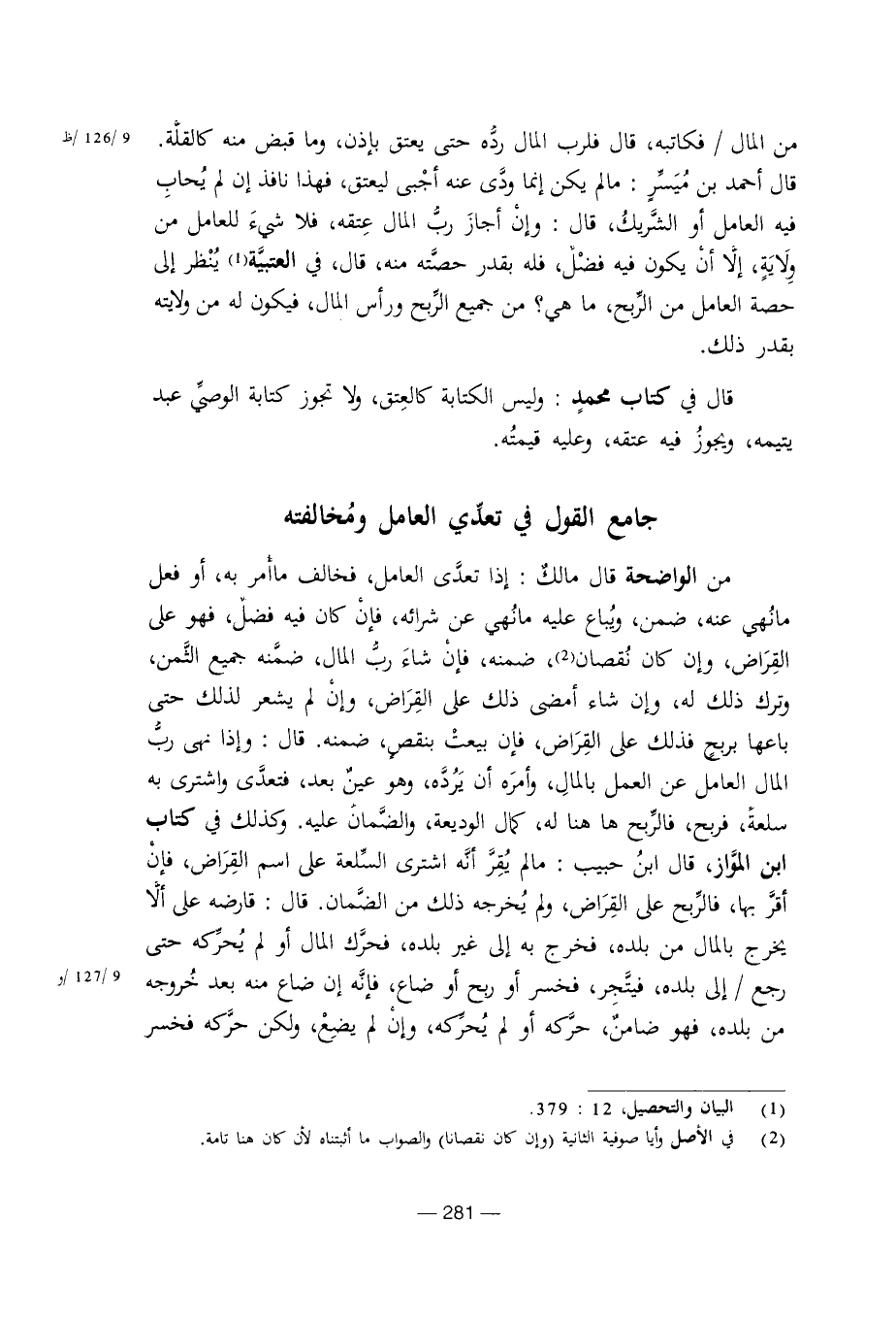 من الواضحة قال مالك: إذا تعدى العامل، فخالف ما أمر به، أو فعل ما نهى عنه، ضمن، ويباع عليه ما نهى ع، شرائه، فإن كان فيه فضل، فهو على القراض، وإن كان نقصان، ضمنه، فإن شاء رب المال، ضمنه جميع الثمن، وترك ذلك له، وإن شاء أمضى ذلك على القراض، وإن لم يشعر لذلك حتى باعها بربح فذلك على القراض، فإن بيعت بنقص، ضمنه. قال: وإذا نهى رب المال العامل عن العمل بالمال، وأمره أن يرده، وهو عين بعد، فتعدى واشترى به سلعة، فربح، فالربح ها هنا له، كمال الوديعة، والضمان عليه. وكذلك في كتاب ابن المواز، قال ابن حبيب: ما لم يقر أنه اشترى السلعة على اسم القراض، فإن أقر بها، فالربح على القراض، ولم يخرجه ذلك من الضمان. قال: قارضه على ألا يخرج بالمال من بلده، فخرج به إلى غير بلده، فحرك المال أو لم يحركه حتى رجع / إلى بلده، فيتجر، فخسر أو ربح أو ضاع، فإنه إن ضاع منه بعد خروجه من بلده، فهو ضامن، حركه أو لم يحركه، وإن لم يضع، ولكن حركه فخسر