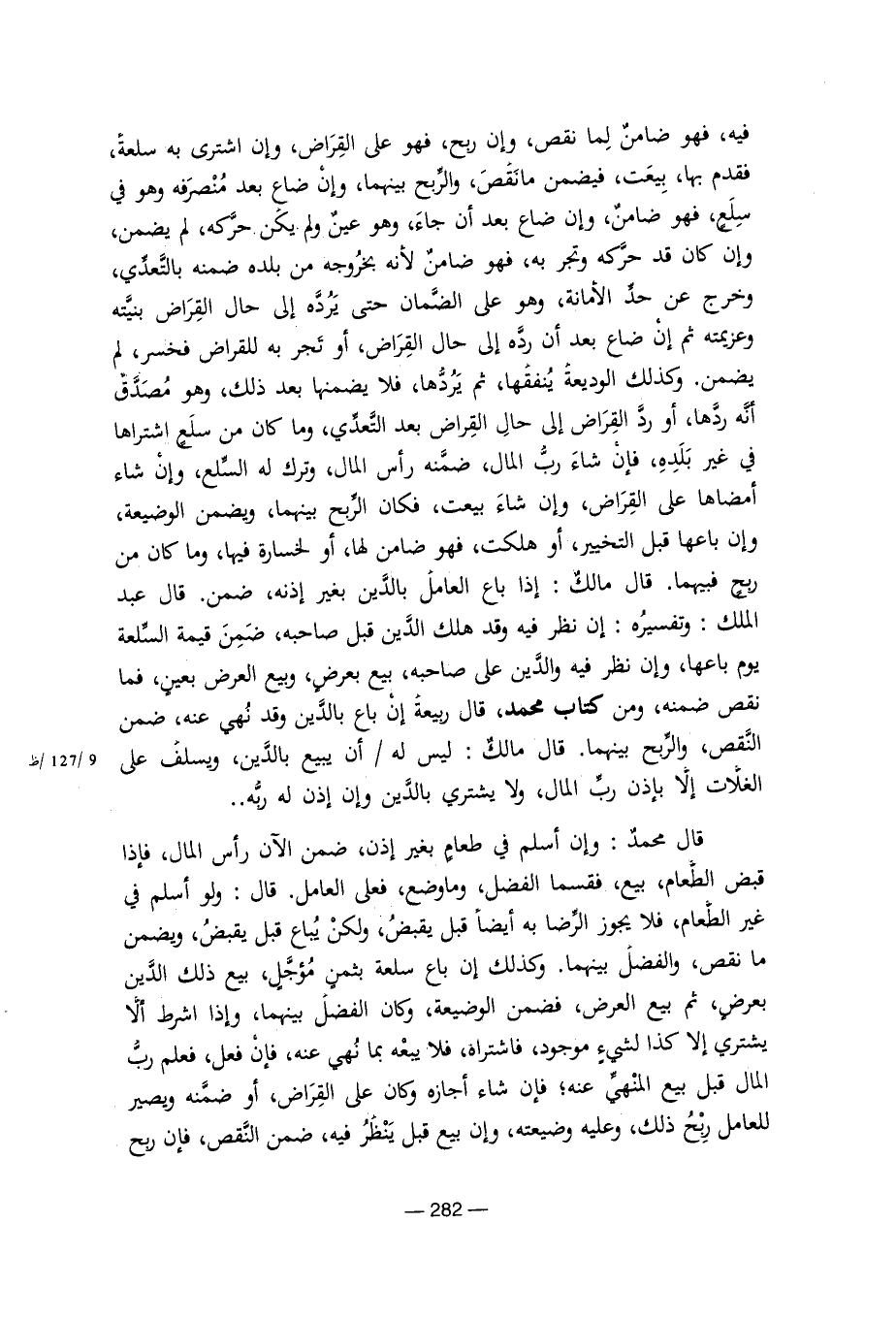فيه، فهو ضامن لما نقص، وإن ربح، فهو على القراض، وإن اشترى به سلعة، فقدم بها، بيعت، فيضمن ما نقص، والربح بينهما، وإن ضاع بعد منصرفه وهو في سلع، فهو ضامن، وإن ضاع بعد أن جاء، وهو عين ولم يكن حركه، لم يضمن، وإن كان قد حركه وتجر به، فهو ضامن لأنه بخروجه من بلده ضمنه بالتعدي، وخرج عن حد الأمانة، وهو على الضمان حتى يرده إلى حال القراض بنيته وعزيمته ثم إن ضاع بعد أن رده إلى حال القراض، أو تجر به للقراض فخسر، لم يضمن. وكذلك الوديعة ينفقها، ثم يردها، فلا يضمنها بعد ذلك، وهو مصدق أنه ردها، فإن شاء رب المال، ضمنه رأس المال، وترك له السلع، وإن شاء أمضاها على القراض، وإن شاء بيعت، فكان الربح بينهما، ويضمن الوضيعة، وإن باعها قبل التخيير، أو هلكت، فهو ضامن لها، أو لخسارة فيها، وما كان من ربح فيهما. قال مالك: إذا باع العامل بالدين بغير إذنه، ضمن. قال عبد الملك: وتفسيره: إن نظر فيه وقد هلك الدين قبل صاحبه، ضمن قيمة السلعة يوم باعها، وإن نظر فيه والدين على صاحبه، بيع بعرض، وبيع العرض بعين، فما نقص ضمنه، ومن كتاب محمد، قال ربيعة إن باع بالدين وقد نهى عنه، ضمن النقص، والربح بينهما. قال مالك: ليس له / أن يبيع بالدين، ويسلف على الغلات إلا بإذن رب المال، ولا يشتري بالدين وإن إذن له ربه. . .