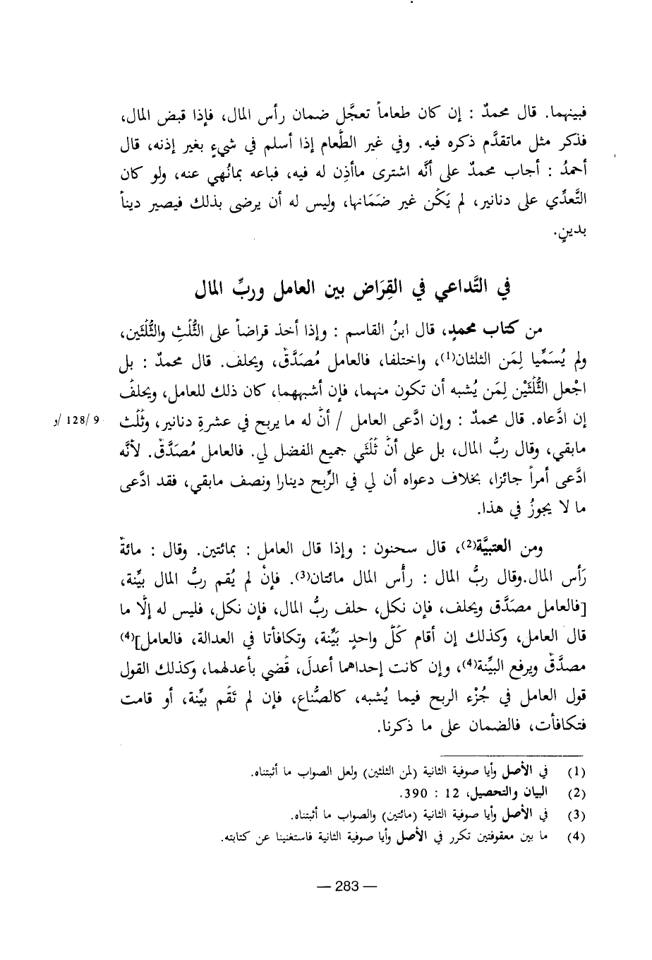 من كتاب محمد، قال ابن القاسم: وإذا أخذ قراضا على الثلث والثلثين، ولم يسميا لمن الثلثان، واختلفا، فالعامل مصدق، ويحلف. قال محمد: بل اجعل الثلثين لمن يشبه أن تكون منهما، فإن أشبههما، كان ذلك للعامل، ويحلف إن ادعاه. قال محمد: وإن ادعى العامل / أن له ما يربح في عشرة دنانير، وثلث ما بقي، وقال رب المال، بل على أن ثلثي جميع الفضل لي. فالعامل مصدق. لأنه ادعى أمرا جائزا، بخلاف دعواه أن لي في الربح دينارا ونصف ما بقي، فقد ادعى ما لا يجوز في هذا.