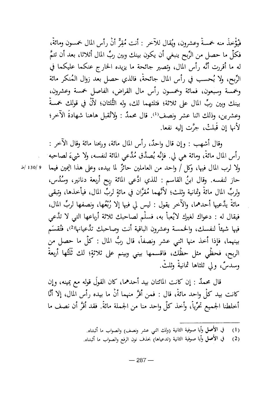 وقال أشهب: وإن قال واحد، رأس المال مائة، وربحنا مائة وقال الآخر: رأس المال مائة، ومائة هي إلي. فإنه يصدق مدعي المائة لنفسه، ولا شيء لصاحبه ولا لرب المال فيها، وكل / واحد من العاملين حائز لما بيده، وعلى هذا اليمين فيما حاز لنفسه. وقال ابن القاسم: للذي ادعى المائة ربح أربعة دنانير، وسدس، ولرب المال مائة وثمانية وثلث؛ لأنهما مقران في مائة لرب المال، فيأخذها، وتبقى مائة يدعيها أحدهما، والآخر يقول: ليس لي فيها إلا ربعها، ونصفها لرب المال، فيقال له: دعواك لغيرك لا يعبأ به، فسلم لصاحبك ثلاثة أرباعها التي لا تدعي فيها شيئا لنفسك، والخمسة وعشرون الباقية أنت وصاحبك تدعيانها، فتقسم بينهما، فإذا أخذ منها اثنى عشر ونصفا، قال رب المال: كل ما حصل من الربح، فحظي مثل حظك، فاقسمها بيني وبينهم على ثلاثة؛ لك ثلثها أربعة وسدس، ولي ثلثاها ثمانية وثلث.