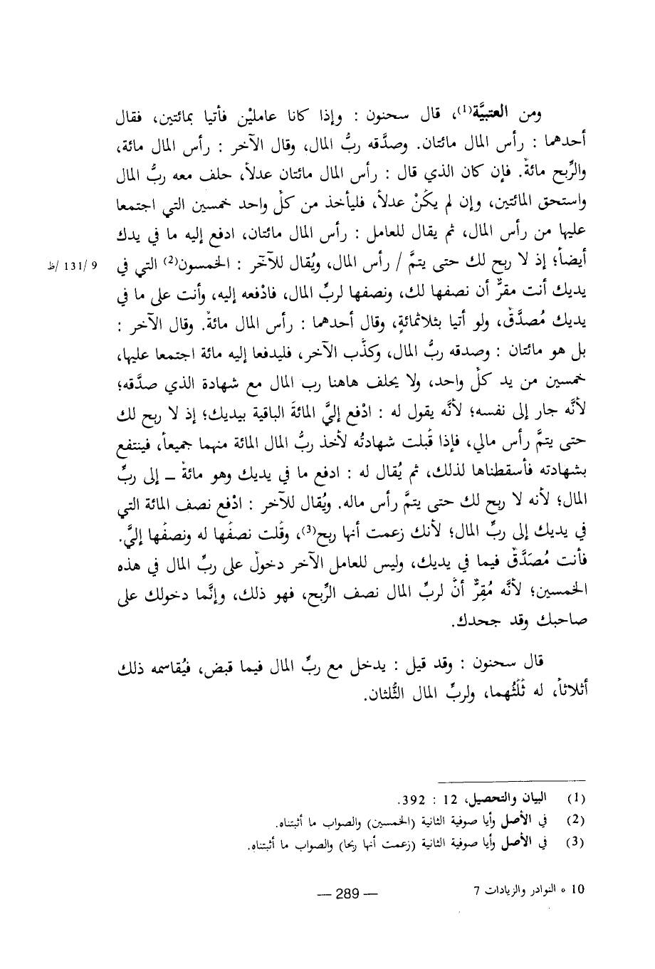 ومن العتبية، قال سحنون: وإذا كانا عاملين فأتيا بمائتين، فقال أحدهما: رأس المال مائتان. وصدقه رب المال، وقال الآخر: رأس المال مائة، والربح مائة. فإن كان الذي قال: رأس المال مائتان عدلا، حلف معه رب المال واستحق المائتين، وإن لم يكن عدلا، فليأخذ من كل واحد خمسين التي اجتمعا عليها من رأس المال، ثم يقال للعامل: رأس المال مائتان، ادفع إليه ما في يدك أيضا؛ إذ لا ربح لك حتى يتم / رأس المال، ويقال للآخر: الخمسون التي في يديك أنت مقر أن نصفها لك، ونصفها لرب المال، فادفعه إليه، وأنت على ما في يديك مصدق، ولو أتيا بثلاثمائة، وقال أحدهما: رأس المال مائة. وقال الآخر: بل هو مائتان: وصدقه رب المال، وكذب الآخر، فليدفعا إليه مائة اجتمعا عليها، خمسين من يد كل واحد، ولا يحلف ها هنا رب المال مع شهادة الذي صدقه؛ لأنه جار إلى نفسه؛ لأنه يقول له: ادفع إلى المائة الباقية بيديك؛ إذ لا ربح لك حتى يتم رأس مالي، فإذا قبلت شهادته لأخذ رب المال المائة منهما جميعا، فينتفع بشهادته فأسقطناها لذلك، ثم يقال له: ادفع ما في يديك وهو مائة ـ إلى رب المال؛ لأنه لا ربح لك حتى يتم رأس ماله. ويقال للآخر: ادفع نصف المائة التي في يديك إلى رب المال؛ لأنك زعمت أنها ربح، وقلت نصفها له ونصفها إلي.