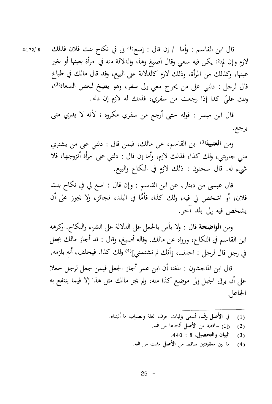 ومن العتبية ابن القاسم، عن مالك، فيمن قال: دلني على من يشتري مني جاريتي، ولك كذا، فذلك لازم، وأما إن قال: دلني على امرأة أتزوجها، فلا شيء له. قال سحنون: ذلك لازم في النكاح والبيع.