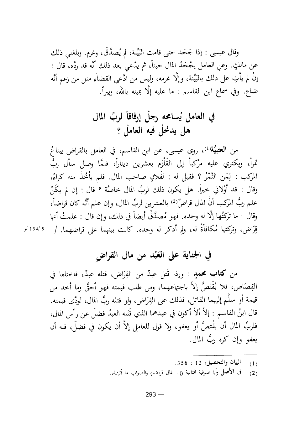 قال ابن القاسم: إلا ألا أكون في عبدهما الذي قتله العبد فضل عن رأس المال، فلرب المال أن يقتص أو يعفو، ولا قول للعامل إلا أن يكون في فضل، فله أن يعفو وإن كره رب المال.