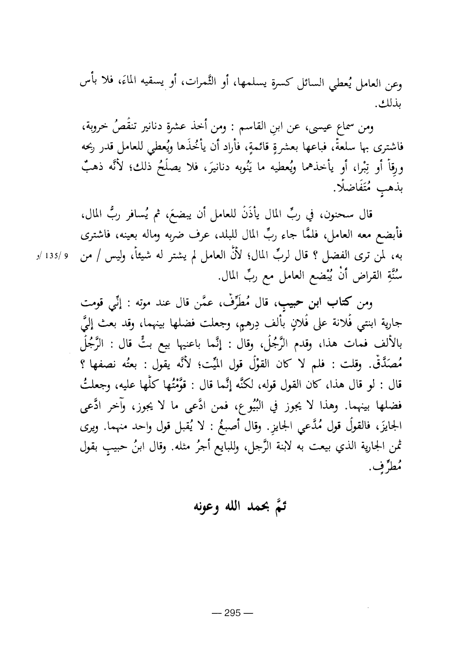 ومن سماع عيسى، عن ابن القاسم، ومن أخذ عشرة دنانير تنقص خروبة، فاشترى بها سلعة، فباعها بعشرة قائمة، فأراد أن يأخذها ويعطي للعامل قدر ربحه ورقا أو تبرا، أو يأخذهما ويعطيه ما ينوبه دنانير، فلا يصلح ذلك؛ لأنه ذهب بذهب متفاضلا.