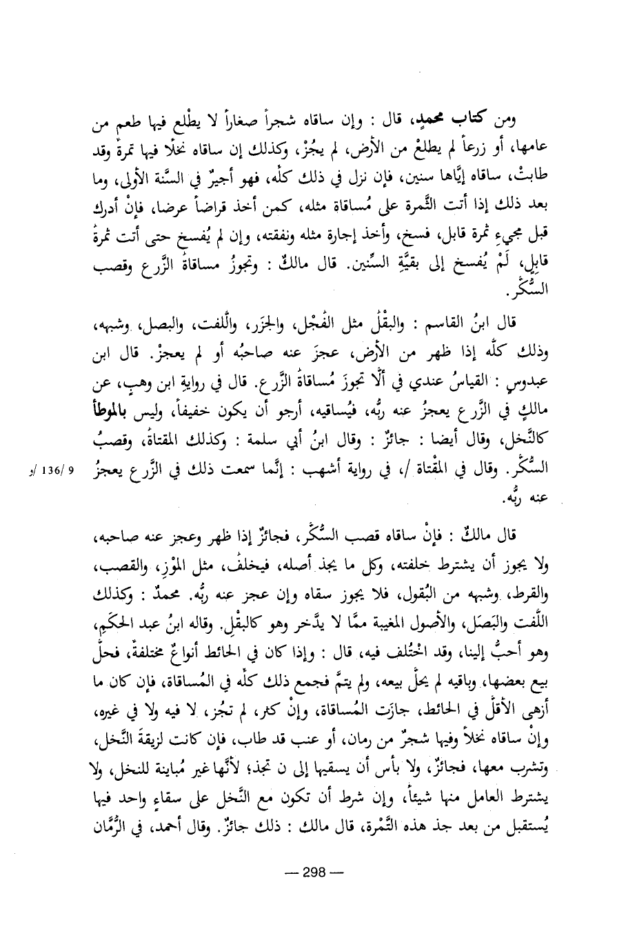 قال مالك: فإن ساقاه قصب السكر، فجائز إذا ظهر وعجز عنه صاحبه، ولا يجوز إن يشترط خلفته، وكل ما يجذ أصله، مثل الموز، والقصب، والقرط وشبهه من البقول، فلا يجوز سقاه وإن عجز عنه ربه. محمد: كذلك اللفت والبصل، والأصول المغيبة مما لا يدخر وهو كالبقل. وقاله ابن عبد الحكم، وهو أحب إلينا، وقد اختلف فيه، قال: وإذا كان في الحائط أنواع مختلفة، فحل بيع بعضها، وباقيه لم يحل بيعه، ولم يتم فجمع ذلك كله في المساقاة، فإن كان ما أزهى الأقل في الحائط، جازت المساقاة، وإن كثر، لم تجز، ولا فيه ولا في غيره، وإن ساقاه نخلا وفيها شجر من رمان أو عنب قد طاب، فإن كانت لزيقة النخل، وتشرب معها، فجائز، ولا بأس أن يسقيها إلى أن تجذ؛ لأنها غير مباينة للنخل، ولا يشترط العامل منها شيئا، وإن شرط أن تكون مع النخل على سقاء واحد فيها يستقبل من بعد جذ هذه التمرة، قال مالك: ذلك جائز. وقال أحمد، في الرمان