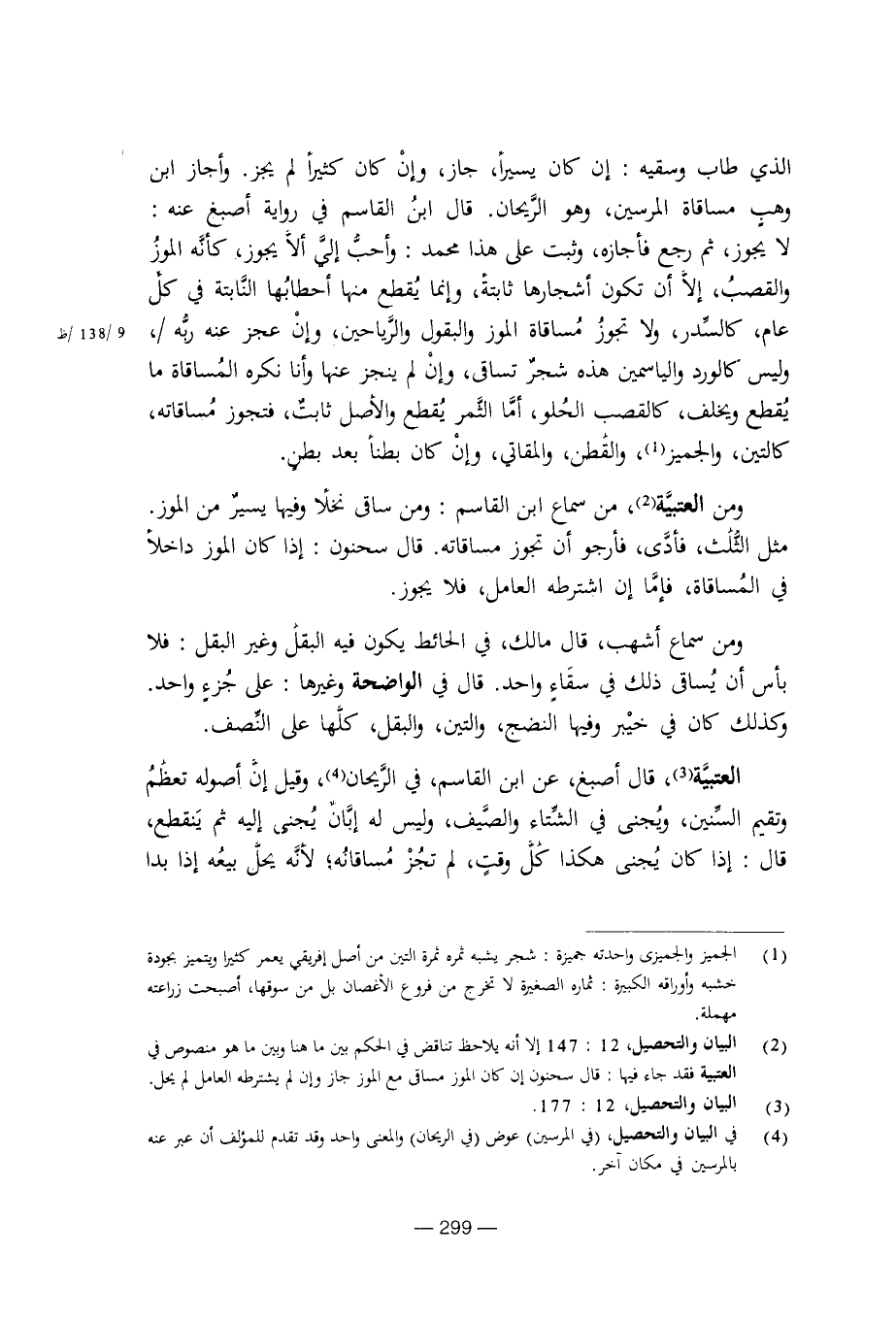 الذي طاب وسقيه: إن كان يسيرا، جاز، وإن كان كثيرا لم يجز. وأجاز ابن وهب مساقاة المرسين، وهو الريحان. قال ابن القاسم في رواية أصبغ عنه: لا يجوز، ثم رجع فأجازه، وثبت على هذا محمد: وأحب إلي ألا يجوز، كأنه الموز والقصب، إلا أن تكون أشجارها ثابتة، وإنما يقطع منها أحطابها النابتة في كل عام، كالسدر، ولا تجوز المساقاة الموز والبقول والرياحين، وإن عجز عنه ربه /، وليس كالورد والياسمين هذه شجر تساقى، وإن لم ينجز عنها وأنا نكره المساقاة ما يقطع ويختلف، كالقصب الحلو، أما التمر يقطع والأصل ثابت، فتجوز مساقاته، كالتين، والجميز، والقطن، والمقاتي، وإن كان بطنا بعد بطن.
