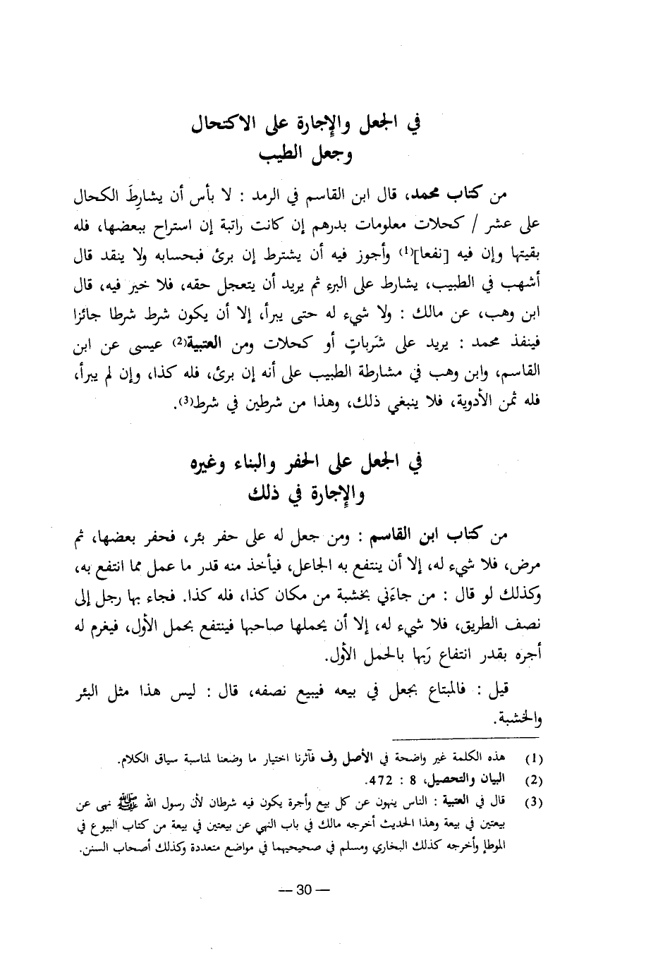 من كتاب محمد، قال ابن القاسم في الرمد: لا بأس أن يشارط الكحال على عشر / كحلات معلومات بدرهم إن كانت راتبة إن استراح ببعضها، فله بقيتها وإن فيه [نفعا] وأجوز فيه أن يشترط إن برئ فبحسابه ولا ينقد قال أشهب في الطبيب، يشارط على البرء ثم يريد أن يتعجل حقه، فلا خير فيه، قال ابن وهب، عن مالك: ولا شيء له حتى يبرأ، إلا أن يكون شرط شرطا جائزا فينفذ محمد: يريد على شربات أو كحلات ومن العتبية عيسى عن ابن القاسم، وابن وهب في مشارطة الطبيب على أنه إن برئ فله كذا، وإن لم يبرأ، فله ثمن الأدوية، فلا يبنغي ذلك، وهذا من شرطين في شرط.