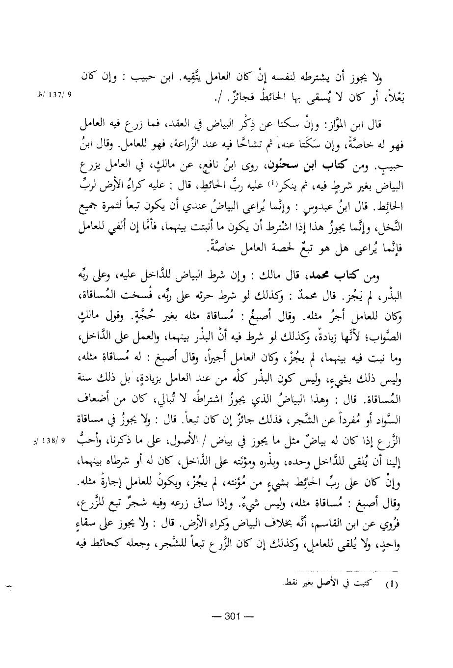 ومن كتاب محمد، قال مالك: وإن شرط البياض للداخل عليه، وعلى ربه البذر، لم يجز. قال محمد: وكذلك لو شرط حرثه على ربه، فسخت المساقاة، وكان للعامل أجر مثله. وقال أصبغ: مساقاة مثله بغير حجة. وقول مالك الصواب؛ لأنها زيادة، وكذلك لو شرط فيه أن البذر بينهما، والعمل على الداخل، وما نبت فيه بينهما، لم يجز، وكان العامل أجيرا، وقال أصبغ: له مساقاة مثله، وليس ذلك بشيء وليس كون البذر كله من عند العامل بزيادة، بل ذلك سنة المساقاة. قال:: وهذا البياض الذي يجوز اشتراطه لا تبالي، كان من أضعاف السواد أو مفردا عن الشجر، فذلك جائز إن كان تبعا. قال: ولا يجوز في مساقاة الزرع إذا كان له بياض مثل ما يجوز في بياض / الأصول، على ما ذكرنا، وأحب إلينا أن يلقى للداخل وحده، وبذره ومؤنته على الداخل، كان له أو شرطاه بينهما، وإن كان على رب الحائط بشيء من مؤنته، لم يجز، ويكون للعامل إجارة مثله.