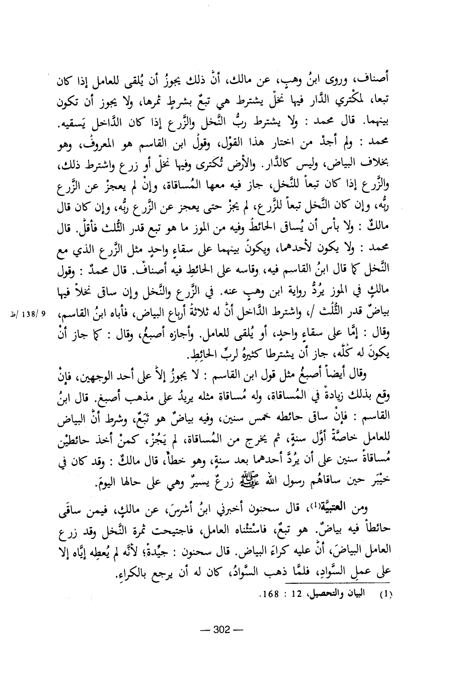 محمد: ولم أجد من اختار هذا القول، وقول ابن القاسم هو المعروف، وهو بخلاف البياض، وليس كالدار. والأرض تكتري وفيها نخل أو زرع واشترط ذلك، والزرع إذا كان تبعا للنخل، جاز فيه معها المساقاة، وإن لم يعجز عن الزرع ربه، وإن كان النخل تبعا للزرع، لم يجز حتى يعجز عن الزرع ربه، وإن كان قال مالك: ولا بأس أن يساقى الحائط وفيه من الموز ما هو تبع قدر الثلث فأقل. قال محمد: ولا يكون لأحدهما، ويكون بينهما على سقاء واحد مثل الزرع الذي مع النخل كما قال ابن القاسم فيه، وقاسه على الحائط فيه أصناف. قال محمد: وقول مالك في الموز يرد رواية ابن وهب عنه. في الزرع والنخل وإن ساقى نخلا فيها بياض قدر الثلث /، واشترط الداخل أن له ثلاثة أرباع البياض، فأباه ابن القاسم، وقال: إما على سقاء واحد، أو يلقى للعامل. وأجازه أصبغ، وقال: كما جاز أن يكون له كله، جاز أن يشترطا كثيره لرب الحائط.