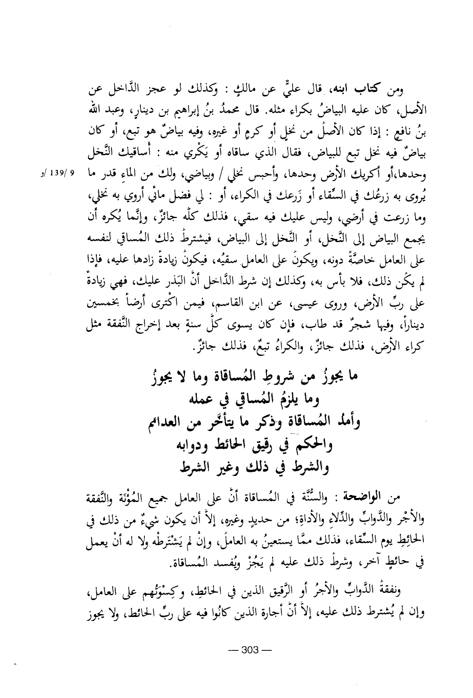 ومن كتاب ابنه، قال علي عن مالك: وكذلك لو عجز الداخل عن الأصل، كان عليه البياض بكراء مثله. قال محمد بن إبراهيم بن دينار، وعبد الله بن نافع: إذا كان الأصل من نخل أو كرم أو غيره، وفيه بياض هو تبع، أو كان بياض فيه نخل تبع للبياض، فقال الذي ساقاه أو يكري منه: أساقيك النخل وحدها، أو أكريك الأرض وحدها، وأحبس نخلي / وبياضي، ولك من الماء قدر ما يروى به زرعك في السقاء أو زرعك في الكراء، أو: إلي فضل مائي أروي به نخلي، وما زرعت في أرضي، وليس عليك فيه سقي، فذلك كله جائز، وإنما يكره أن يجمع البياض إلى النخل أو النخل إلى البياض، فشترط ذلك المساقي لنفسه على العامل خاصة دونه، ويكون على العامل سقيه، فيكون زيادة زادها عليه، فإذا لم يكن ذلك، فلا بأس به، وكذلك إن شرط الداخل إن البذر عليك، فهي زيادة على رب الأرض، وروى عيسى، عن ابن القاسم، فمن اكترى أرضا بخمسين دينارا، وفيها شجر قد طاب، فإن كن يسوى كل سنة بعد إخراج النفقة مثل كراء الأرض، فذلك جائز، والكراء تبع، فذلك جائز.
