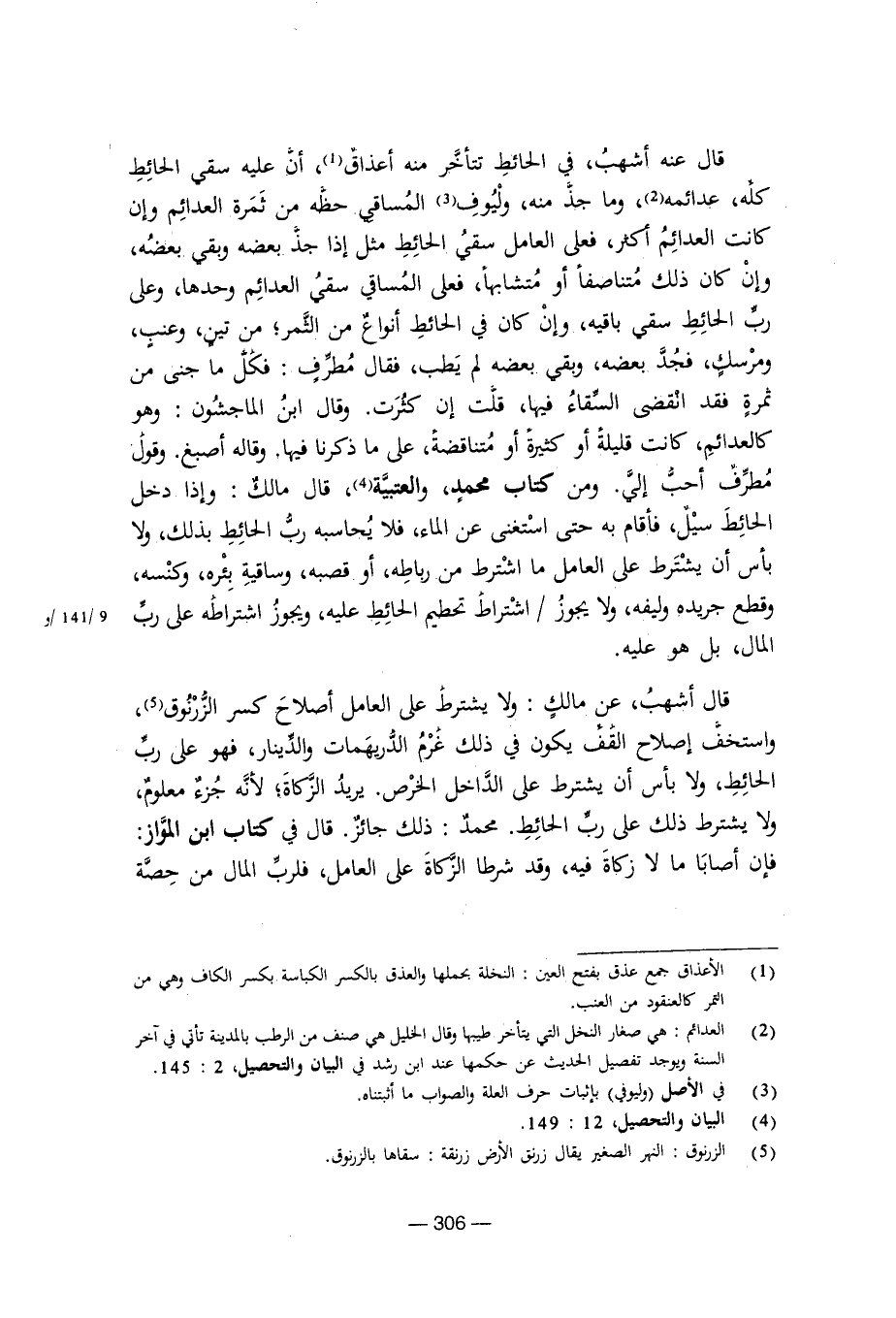 قال عنه أشهب، في الحائط تتأخر منه أعذاق، أن عليه سقي الحائط كله، عدائمه، وما جذ منه، وليوف المساقي حظه من ثمرة العدائم وإن كانت العزائم أكثر، فعلى العامل سقي الحائط مثل إذا جذ بعضه وبقي بعضه، وإن كان ذلك متناصفا أو متشابها، فعلى المساقي سقي العدائم وحدها، وعلى رب الحائط سقي باقيه، وإن كان في الحائط أنواع من الثمر؛ من تبن، وعنب، ومرسك، فجد بعضه، وبقي بعضه لم يطب، فقال مطرف: فكل ما جنى من ثمرة فقد انقضى السقاء فيها، قلت إن كثرت. وقال ابن الماجشون: وهو كالعدائم، كانت قليلة أو كثيرة أو متناقضة، على ما ذكرنا فيها. وقال أصبغ. وقول مطرف أحب إلي. ومن كتاب محمد، والعتبية قال مالك: وإذا دخل الحائط سيل، فأقام به حتى استغنى عن الماء، فلا يحاسه رب الحائط بذلك، ولا بأس أن يشترط على العامل ما اشترط من رباطه، أو قصبه، وساقيه بئره، وكنسه، وقطع جريده وليفه، ولا يجوز / اشتراط تحطيم الحائط عليه، ويجوز اشتراطه على رب المال، بل هو عليه.