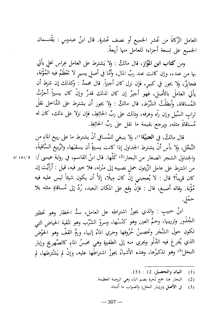 ابن حبيب: والذي يجوز اشتراطه على العامل، سد الخطار وهو تحظير الجذور وتزريبها، وخم العين وهو كنسها، وسرو الشرب وهو تنقية الحياض التي تكون حول الشجر وتحصين حروفها وجري الماء إليها، ورم القف وهو الحوض الذي يفرغ فيه الدلو ويجري منه إلى الطفيرة وهي محبس الماء كالصهريج وإبار النخل وهو تذكيرها، وهذا الأشياء يجوز اشتراطها عليه، وإن لم يشترطها، لم