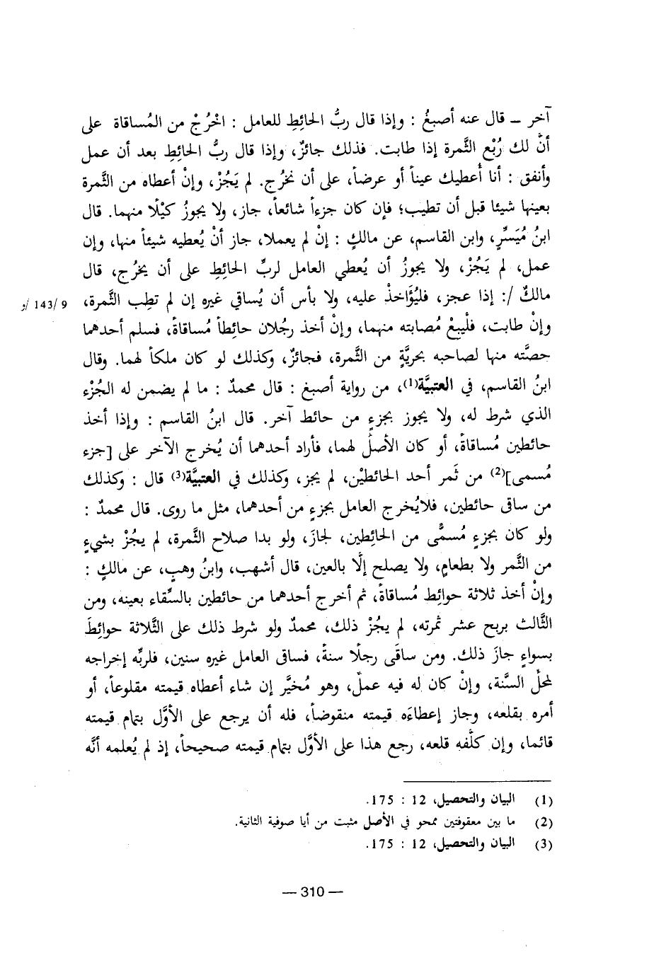 آخر ـ قال عنه أصبغ: وإذا قال رب الحائط للعامل: اخرج من المساقاة على أن لك ربع الثمرة إذا طابت. فذلك جائز، وإذا قال رب الحائط بعد أن عمل وأنفق: أنا أعطيك عينا أو عرضا، على أن نخرج. لم يجز، وإن أعطاه من الثمرة بعينها شيئا قبل أن تطيب؛ فإن كان جزءا شائعا، جاز، ولا يجوز كيلا منهما. قال ابن ميسر، وابن ابن القاسم، عن مالك، إن لم يعملا، جاز أن يعطيه شيئا منها، وإن عمل، لم يجز، ولا يجوز أن يعطي العامل لرب الحائط على أن يخرج، قال مالك /: إذا عجز، فليؤاخذ عليه، ولا بأس أن يساقي غيره إن لم تطب الثمرة، وإن طابت، فليبع مصابته منهما، وإن أخذ رجلان حائطا مساقاة، فسلم أحدهما حصته منها لصاحبه بحرية من الثمرة، فجائز، وكذلك لو كان ملكا لهما. وقال ابن القاسم، في العتبية، من رواية أصبغ: قال محمد: ما لم يضمن له الجزاء الذي شرط له، ولا يجوز بجزء من حائط. قال ابن القاسم: وإذا أخذ حائطين مساقاة، أو كان الأصل لهما، فأراد أحدهما أن يخرج الآخر على [جزء مسمى] من ثمر أحد الحائطين، لم يجز، وكذلك في العتبية قال: وكذلك من ساقي حائطين، فلا يخرج العامل بجزء من أحدهما، مثل ما روى. قال محمد: ولو كان بجزء مسمى من الحائطين، لجاز، ولو بدا صلاح الثمرة، لم يجز بشيء من الثمر ولا بطعام، ولا يصلح إلا بالعين، قال أشهب، وابن وهب، عن مالك: وإن أخذ ثلاثة حوائط مساقاة، ثم أخرج أحدهما من حائطين بالسقاء بعينه، ومن الثالث بربح عشر ثمرته، ولم يجز ذلك، محمد ولو شرط ذلك على الثلاثة حوائط بسواء جاز ذلك. ومن ساقى رجلا سنة، فساقى العامل غيره سنين، فلربه إخراجه أمره بقلعه، وجاز أعطاه قيمته منقوضا، فله أن يرجع على الأول بتمام قيمته قائما، وإن كلفه قلعه، رجع هذا على الأول بتمام قيمته صحيحا، إذ لم يعلمه أنه
