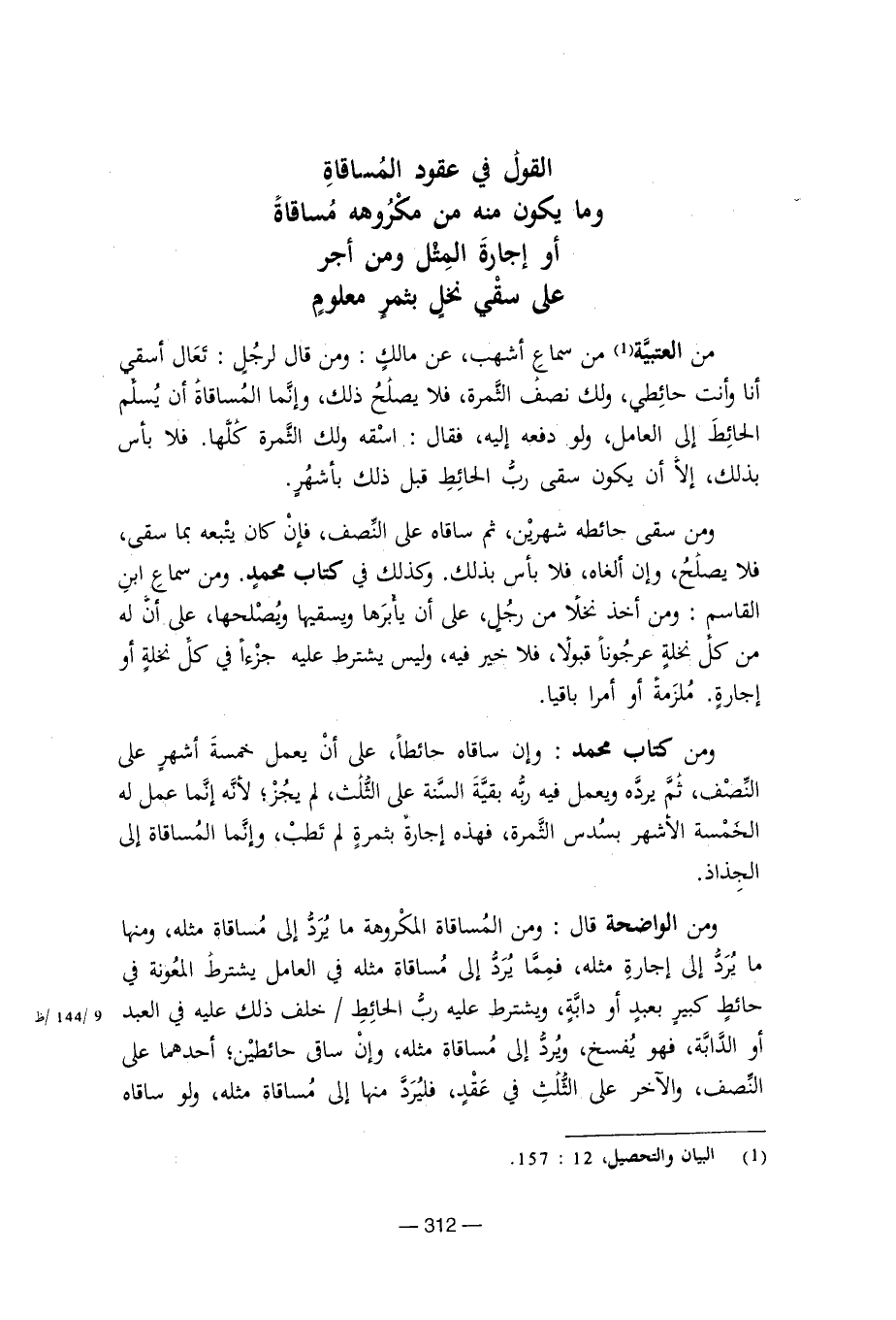 ومن الواضحة قال: ومن المساقاة المكروهة ما يرد إلى مساقاة مثله، ومنها ما يرد إلى إجارة مثله، فمما إلى يرد إلى مساقاة مثله في العامل يشترط المعونة في حائط كبي بعبد أو دابة، ويشترط عليه رب الحائط / خلف ذلك عليه في العبد أو الدابة، فهو يفسخ، ويرد إلى مساقاة مثله، وإن ساقى حائطين؛ أحدهما على النصف، والآخر على الثلث في عقد، فليرد منها إلى مساقاة مثله، ولو ساقاه
