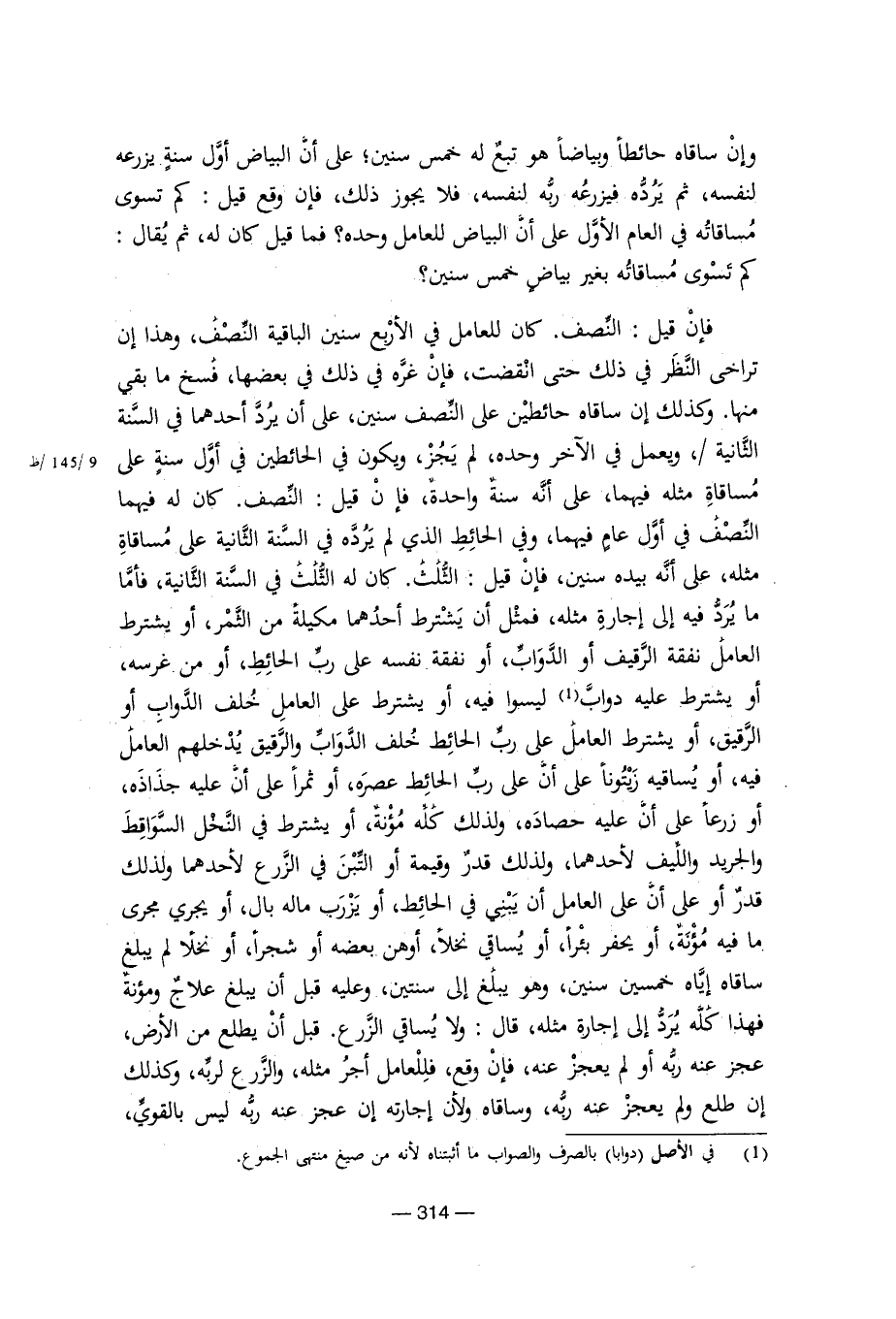 فإن قيل: النصف. كان للعامل في الأربع سنين الباقية النصف، وهذا إن تراخى النظر في ذلك حتى انقضت، فإن غره في ذلك في بعضها، فسخ ما بقي منها. وكذلك إن ساقاه حائطين على النصف سنين، على أن يرد أحدهما في السنة الثانية /، ويعمل في الآخر وحده، لم يجز، ويكون في الحائطين في أول سنة على مساقاة مثله فيهما، على أنه سنة واحدة، فإن قيل: النصف. كان له فيهما النصف في أول عام فيهما، وفي الحائط الذي لم يرده في السنة الثانية على مساقاة مثله، على أن بيده سنين، فإن قيل: الثلث كان له الثلث في السنة الثانية، فأما ما يرد فيه إلى إجارة مثله، فمثل أن يشترط أحدهما مكيلة من الثمر، أو يشترط العامل نفقة الرقيف أو الدواب، أو نفقة نفسه على رب الحائط، أو من غرسه، أو يشترط عليه دواب ليسوا فيه، أو يشترط على العامل خلف الدواب أو الرفيق، أو يشترط العامل على رب الحائط خلف الدواب والرقيق يدخلهم العامل فيه، أو يساقيه زيتونا على أن على رب الحائط عصره، أو ثمرا على أن عليه جذاذه، أو زرعا على أن عليه حصاد، ولذلك كله مؤنة، أو يشترط في النخل السواقط والجريد والليف لأحدهما، ولذلك قدر وقيمة أو التبن في الزعر لأحدهما ولذلك قدر أو على أن على العامل أن يبني في الحائط، أو يزرب ماله بال، أو يجري مجرى ما فيه مؤنة، أو يحفر بئرا، أو يساقي نخلا، أوهن بعضه أو شجرا، أو نخلا، لم يبلغ ساقاه إياه خمسين سنين، وهو يبلغ إلى سنتين، وعليه قبل أن يبلغ علاج ومؤنة فهذا كله يرد إلى إجارة مثله، وقال: ولا يساقي الزع. قبل أن يطلع من الأرض، عجز عنه ربه أو لم يعجز عنه، فإن وقع، فللعامل أجر مثله، والزرع لربه، وكذلك إن طلع ولم يعجز عنه ربه، وساقاه ولأن إجارته إن عجز عنه ربه ليس بالقوي،